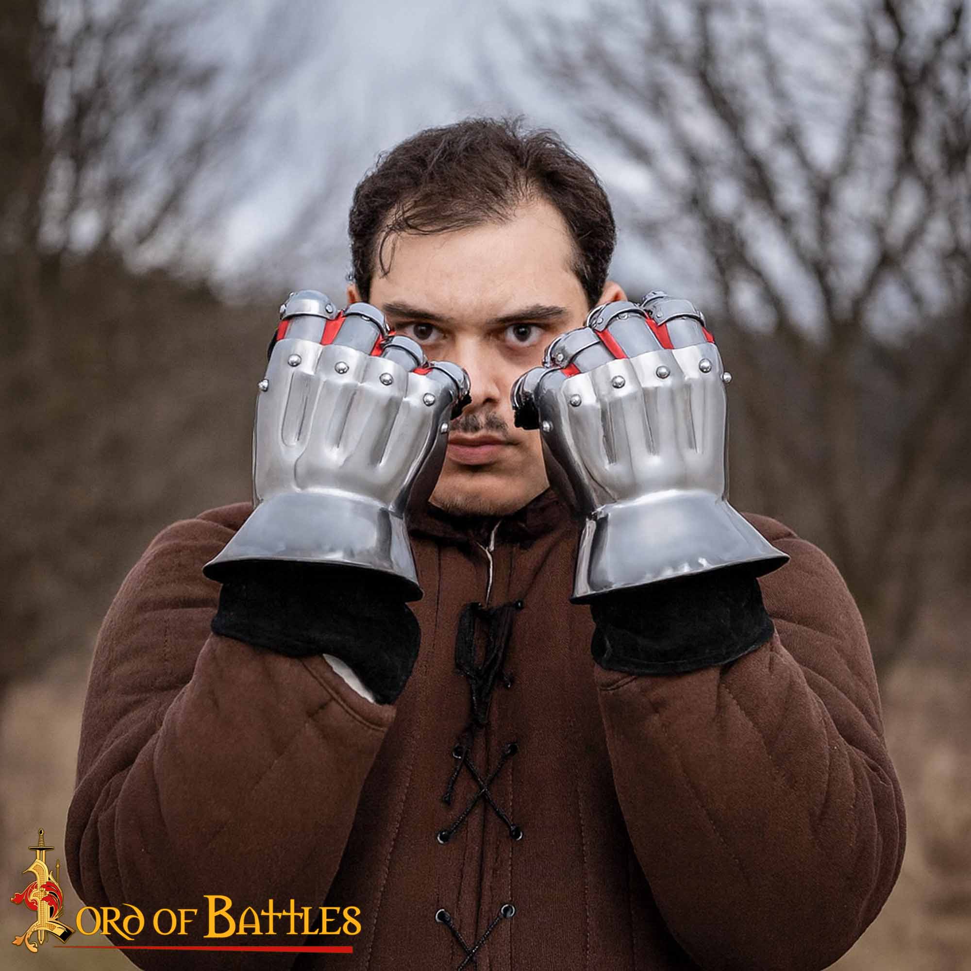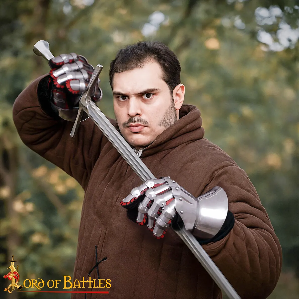 Made from strong 16-gauge mild steel, these hourglass gauntlets feature overlapping finger plates (called lames) that are riveted securely to a flexible leather base. This articulated construction ensures not only solid protection but also excellent finger movement, allowing you to keep a reliable grip on swords, axes, or shields during training, reenactments, or live combat demonstrations.
