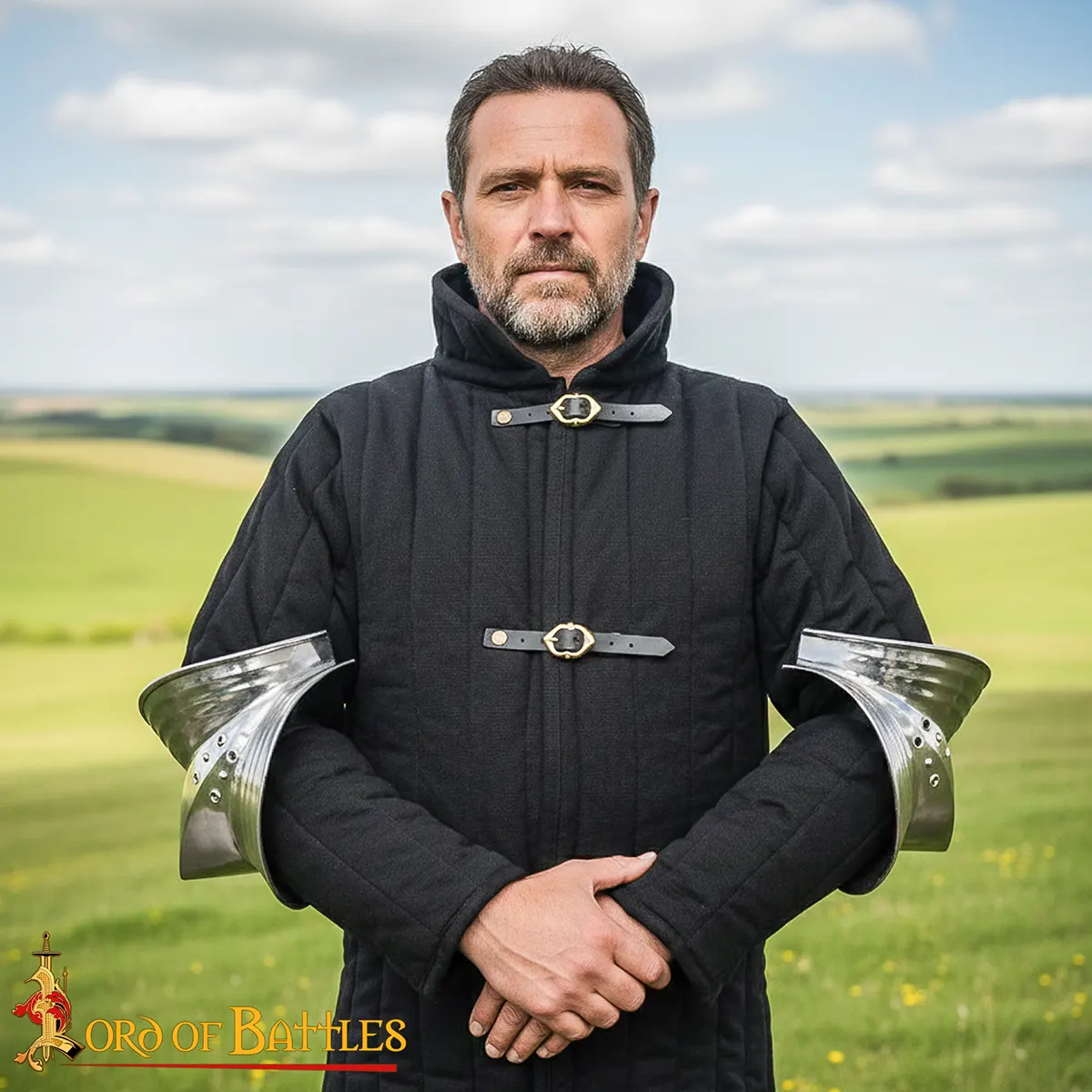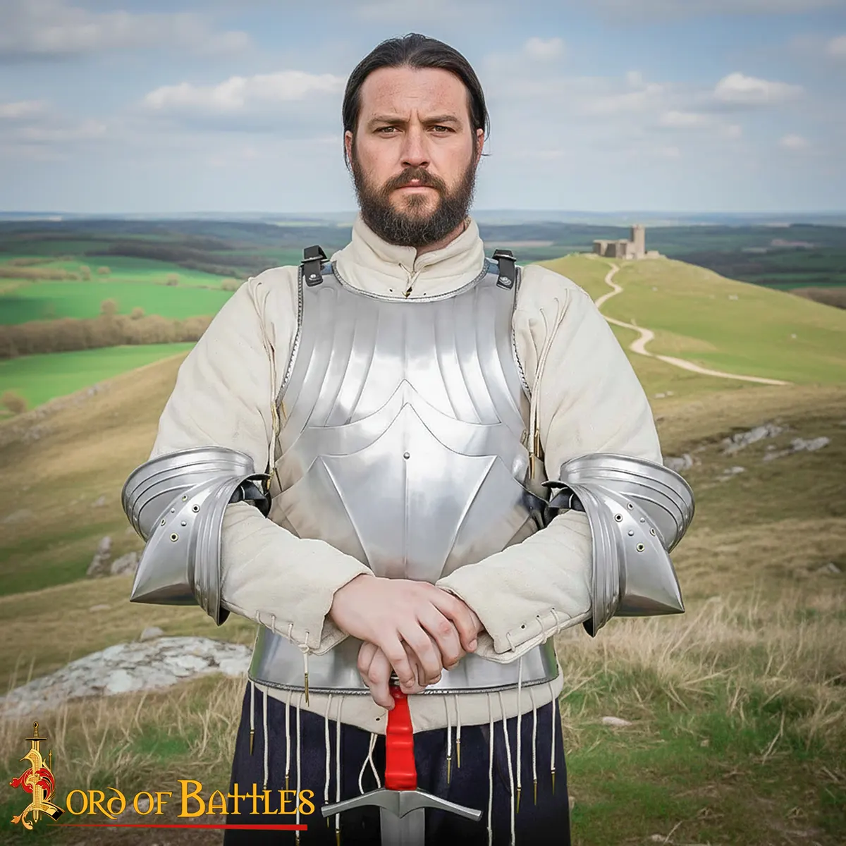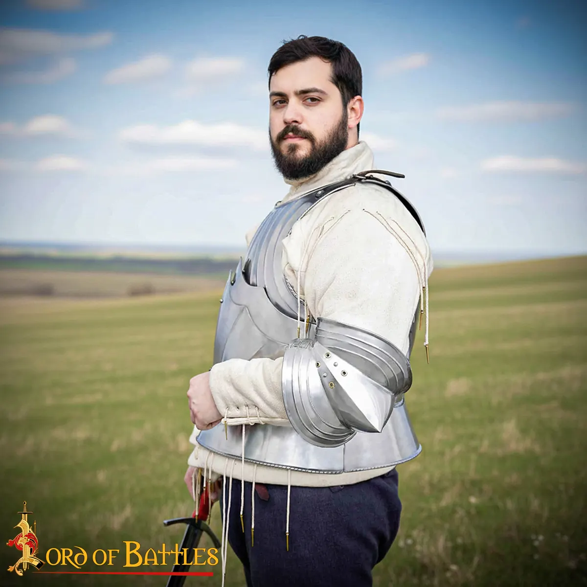 During the late Middle Ages, elbow protection became an important part of full plate armor. German Gothic armor is known for its elegant shaping and fluted surfaces. These couters follow the same designs. Each pair has curved steel plates with period-style fluting with polish. The one size fits all size design has secure leather straps and buckles that help in adjustment and give a stable fit on most arm sizes. The ergonomic shape allows the arm to bend naturally, so they are comfortable for long wear.