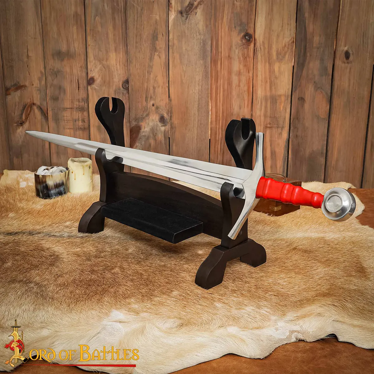 This wooden sword display stand is made from solid hardwood, and gives a strong and stable base for displaying your swords. The smooth dark polish gives it a clean and refined look, making it suitable for both medieval-style setups and modern interiors.