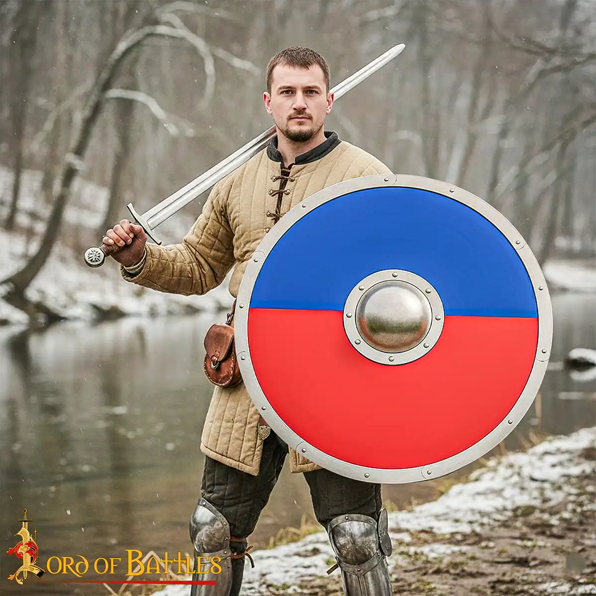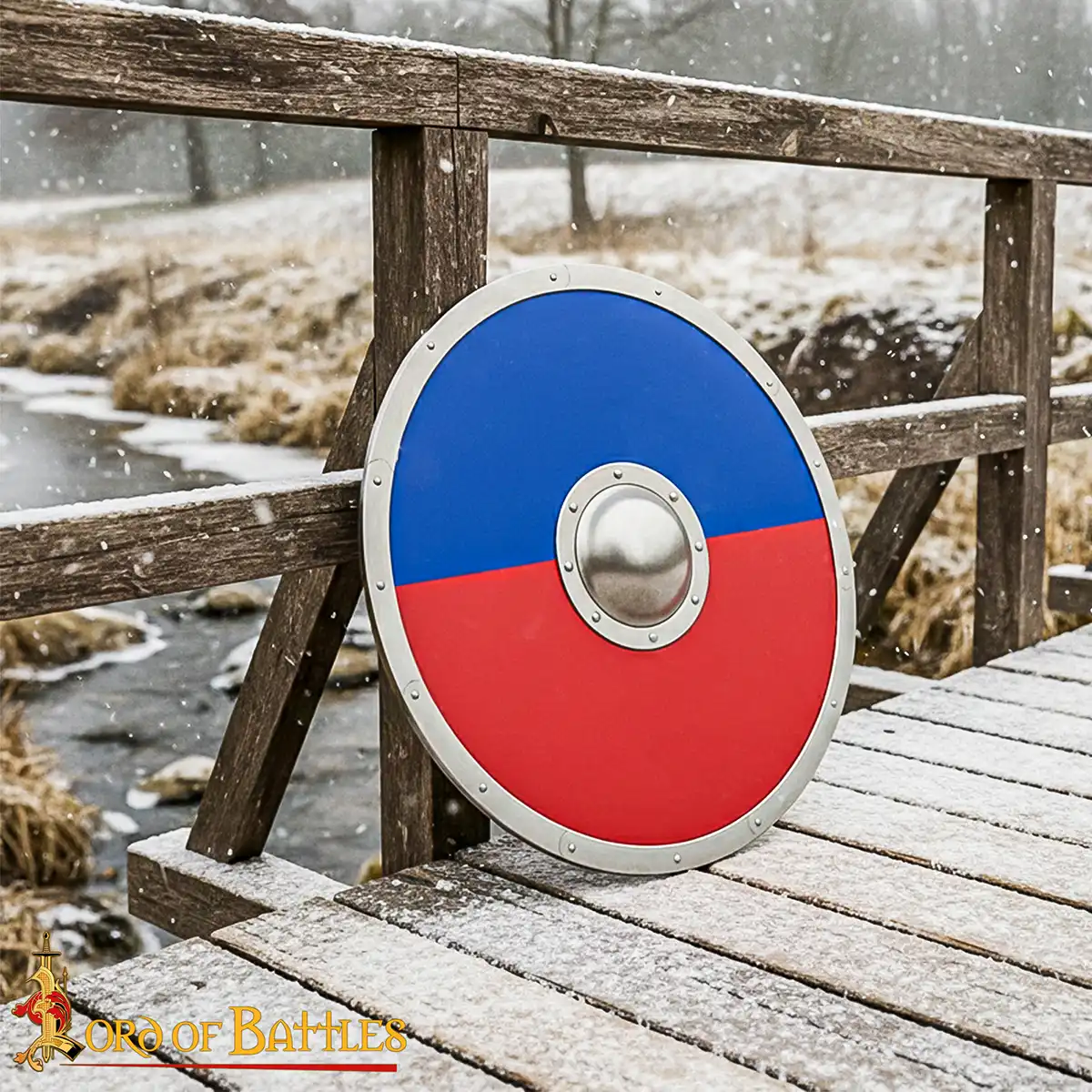 Wooden Warrior Shield: Crafted for performers, and collectors, this Anglo Saxon Shield has a historical design with reliable construction for practical use and display. Made from a solid hardwood body with a sturdy 16-gauge steel umbo and 18-gauge riveted steel border, it has the durability expected from traditional early-medieval shields. This has a two-tone red and blue painted surface, like the popular Anglo Saxon shield design seen in historical sources and modern reproductions..