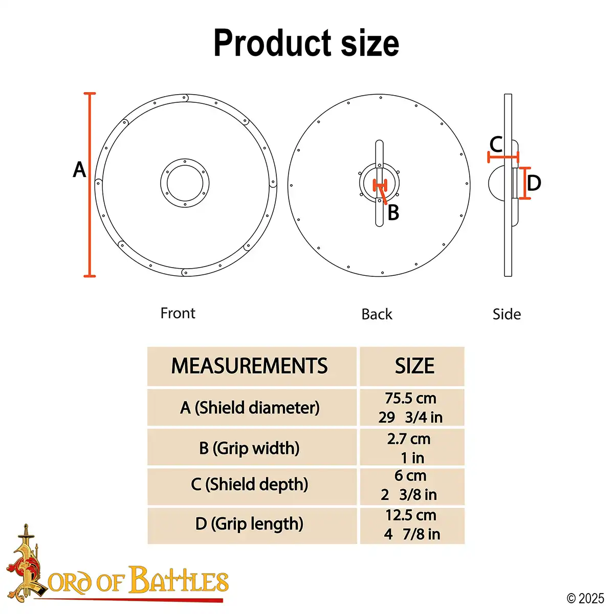 At 30 inches in diameter and weighing approximately 5 kg, this large shield has the perfect medieval feel without being hard to use.The rear wooden grip is securely fitted for reliable handling during stage combat, training demonstrations, or live-action events. The shield’s depth and size make it easy for it to be carried for extended periods.