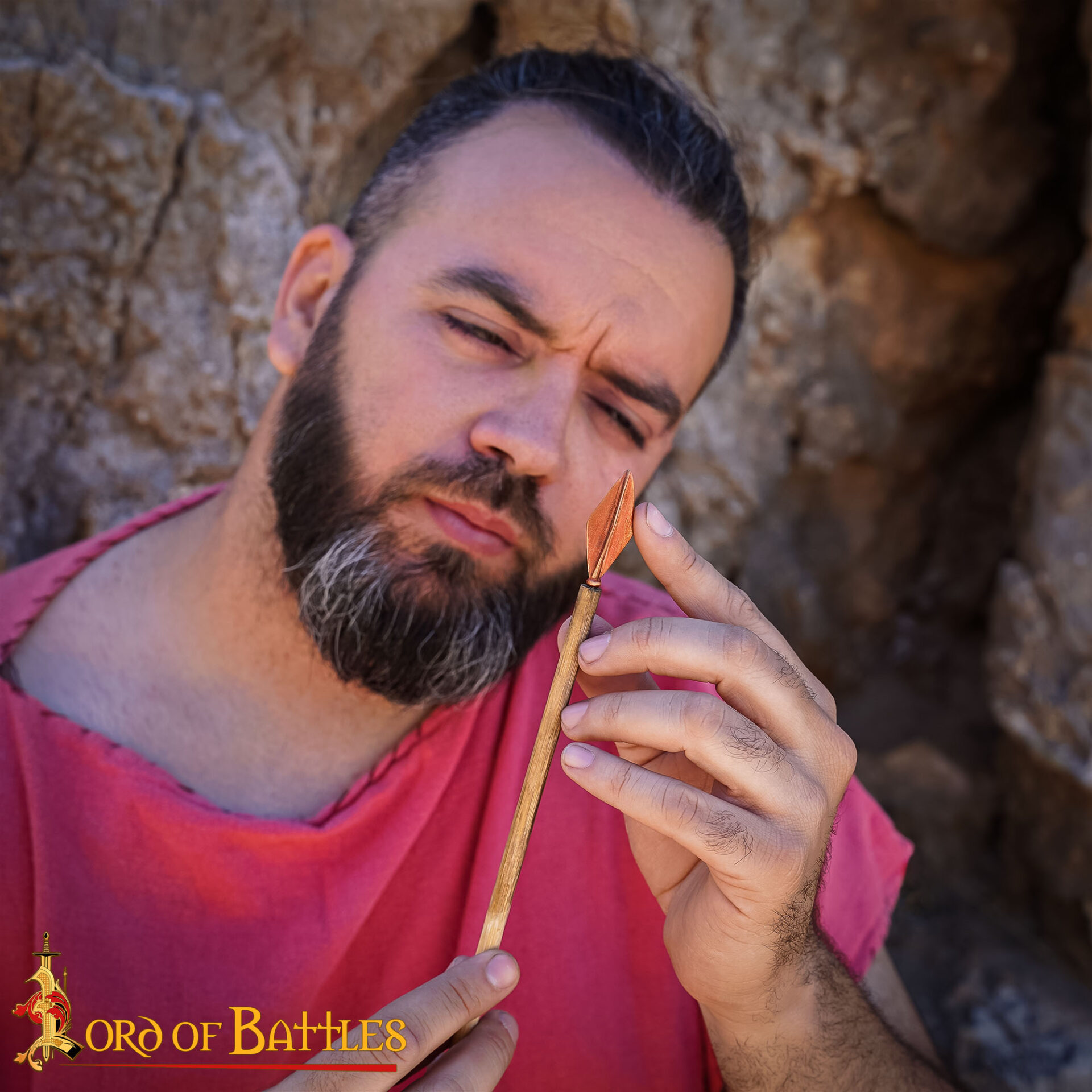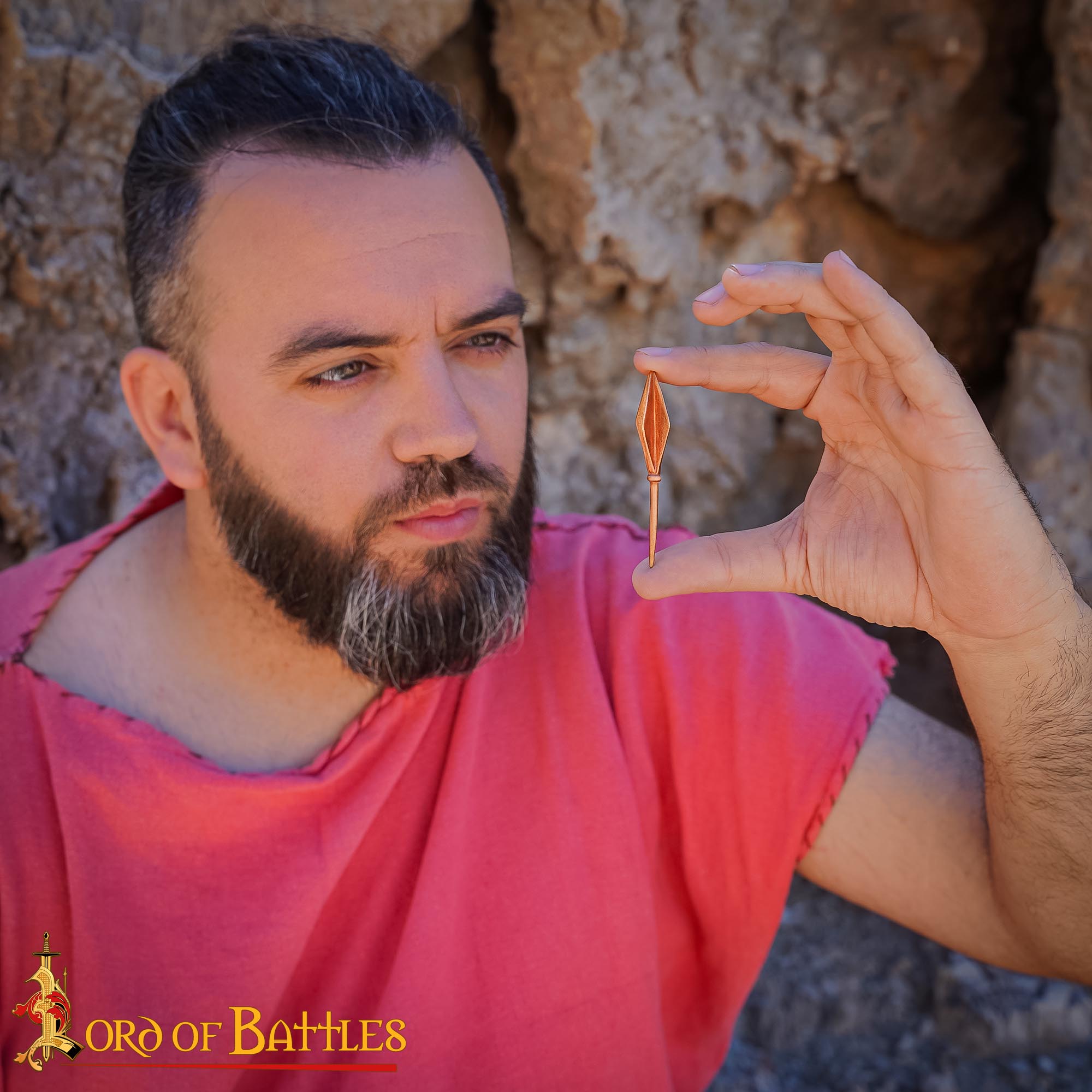 This bronze tanged arrowhead embodies the innovation of early Iron Age warfare and hunting. Used widely from Greece to the Black Sea, it has a slender leaf-blade reinforced by a midrib and a long tang for fastening to wooden shafts with glue or sinew. The subtle collar ring near the base reflects authentic archaeological finds from the 8th–5th centuries BCE.