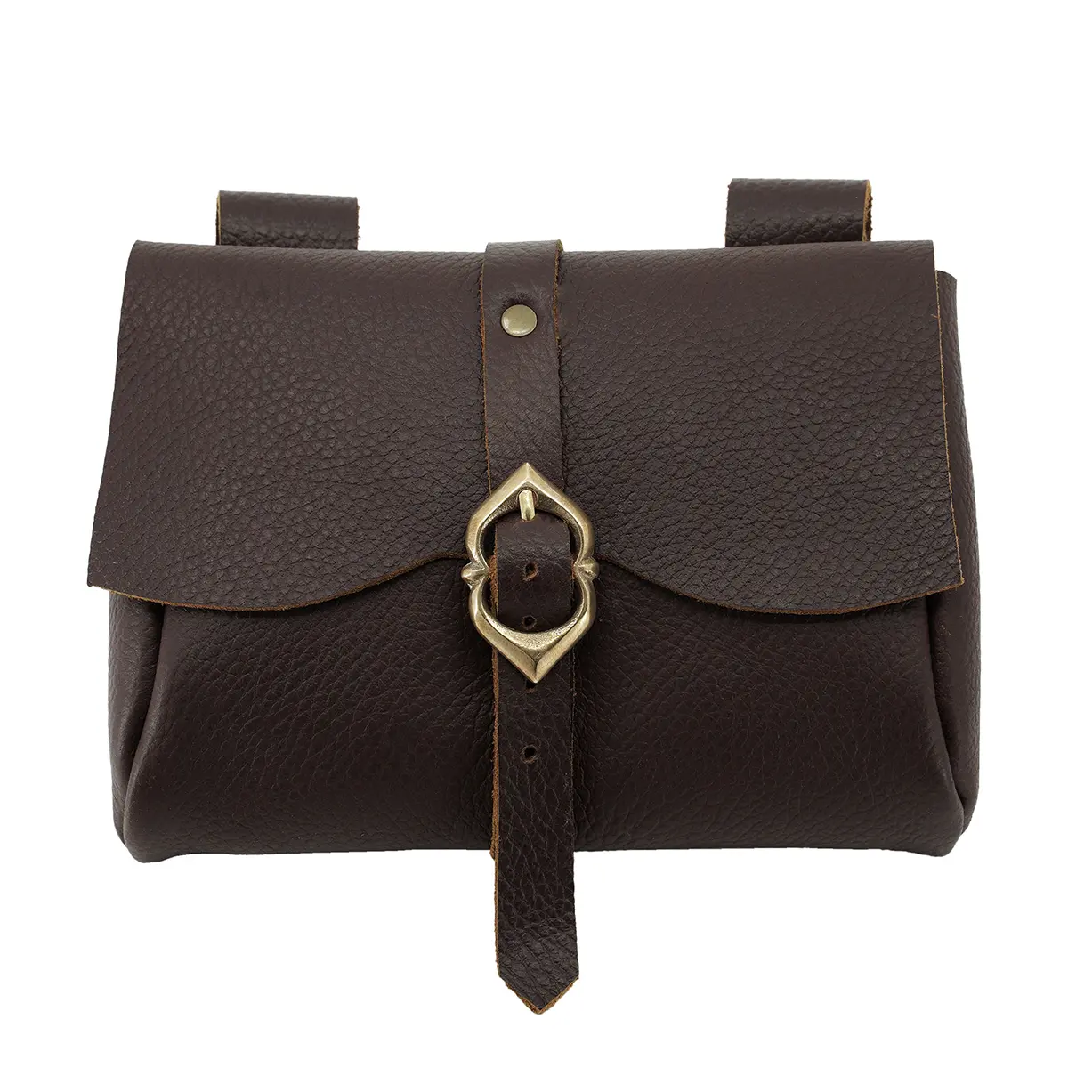The pouch has a solid brass buckle that gives a secure closure. The front strap has adjustment holes, so that you can tighten or loosen the closure as per your preference and product needs. This practical design keeps your belongings safe when used for everyday stuff. The flap design gives a mix of medieval aesthetics with modern use.