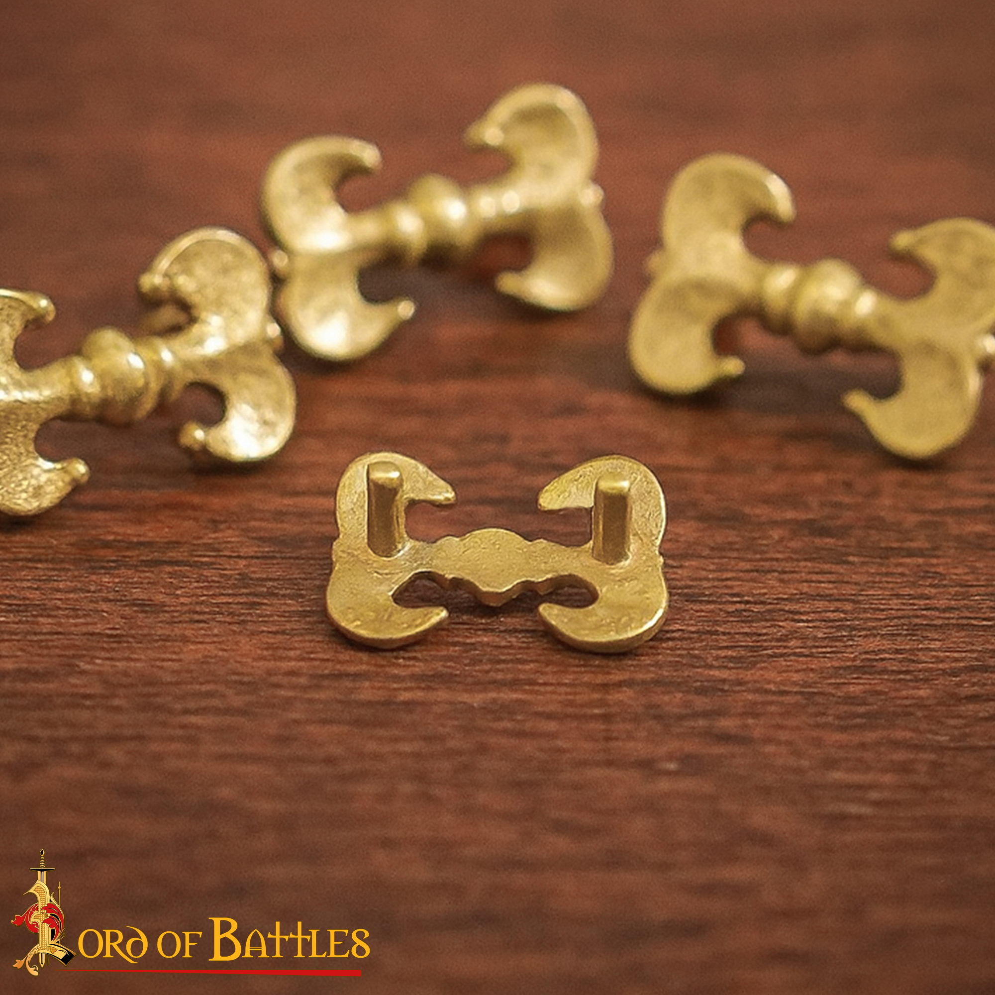 Add authentic medieval detail to your leather projects with this set of 5 Brass Belt Studs, also known as cochos. Each stud is cast from solid brass and features sturdy pegs that allow you to rivet them securely onto belts, pouches, straps, or armor fittings.