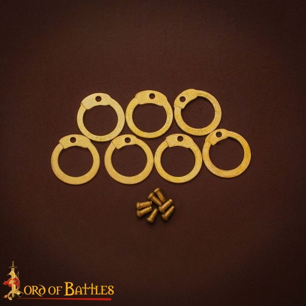 Each ring is pre-punched with a rivet hole, perfectly aligned to fit the included round brass rivets, making your chainmail assembly faster and more reliable. Once riveted, the rings lock securely, producing a strong and resilient mail pattern capable of withstanding handling for reenactments, LARP combat, or stage performances. Their warm golden brass finish adds not only durability but also visual richness, giving your armor or costume a striking edge.