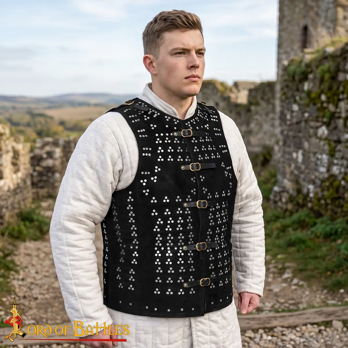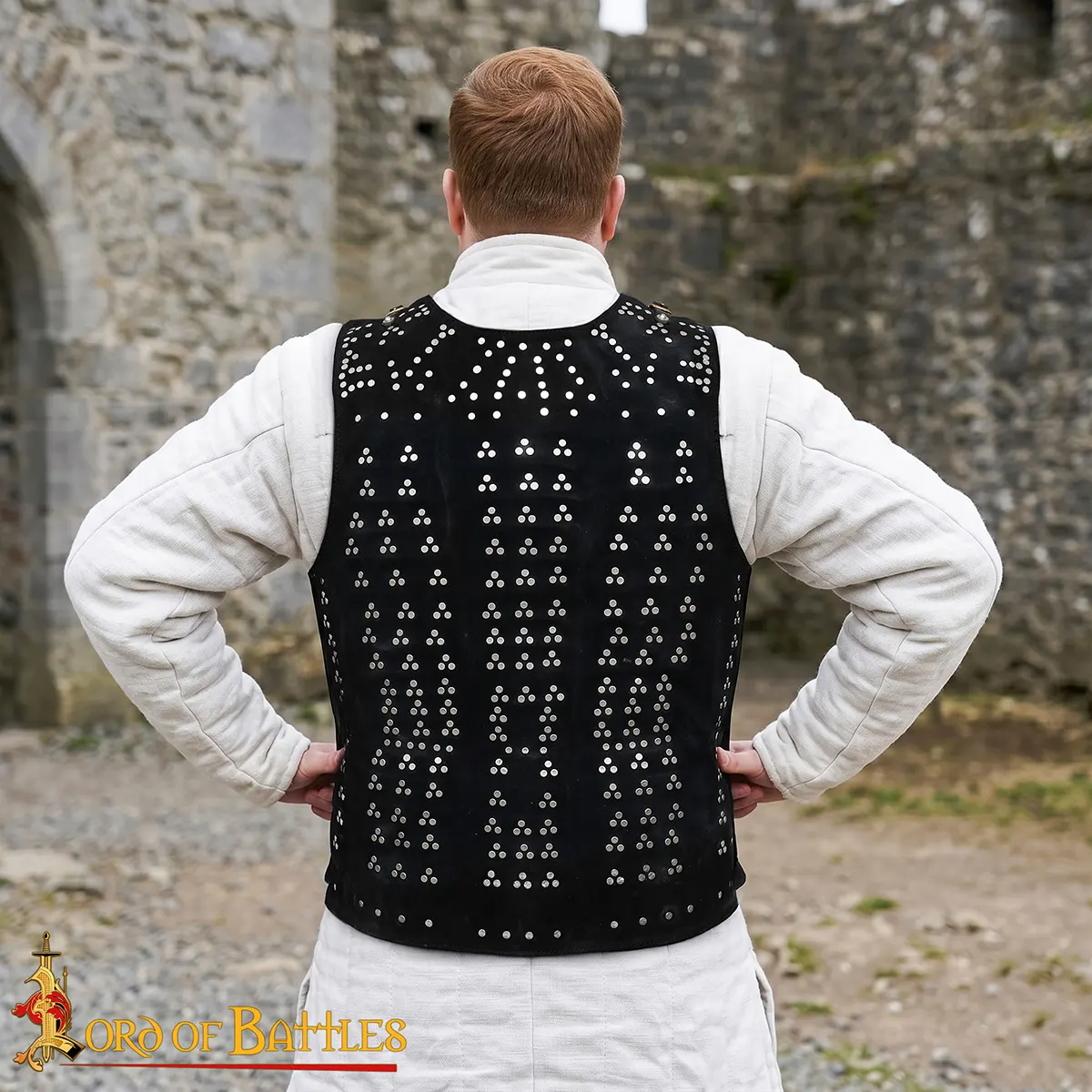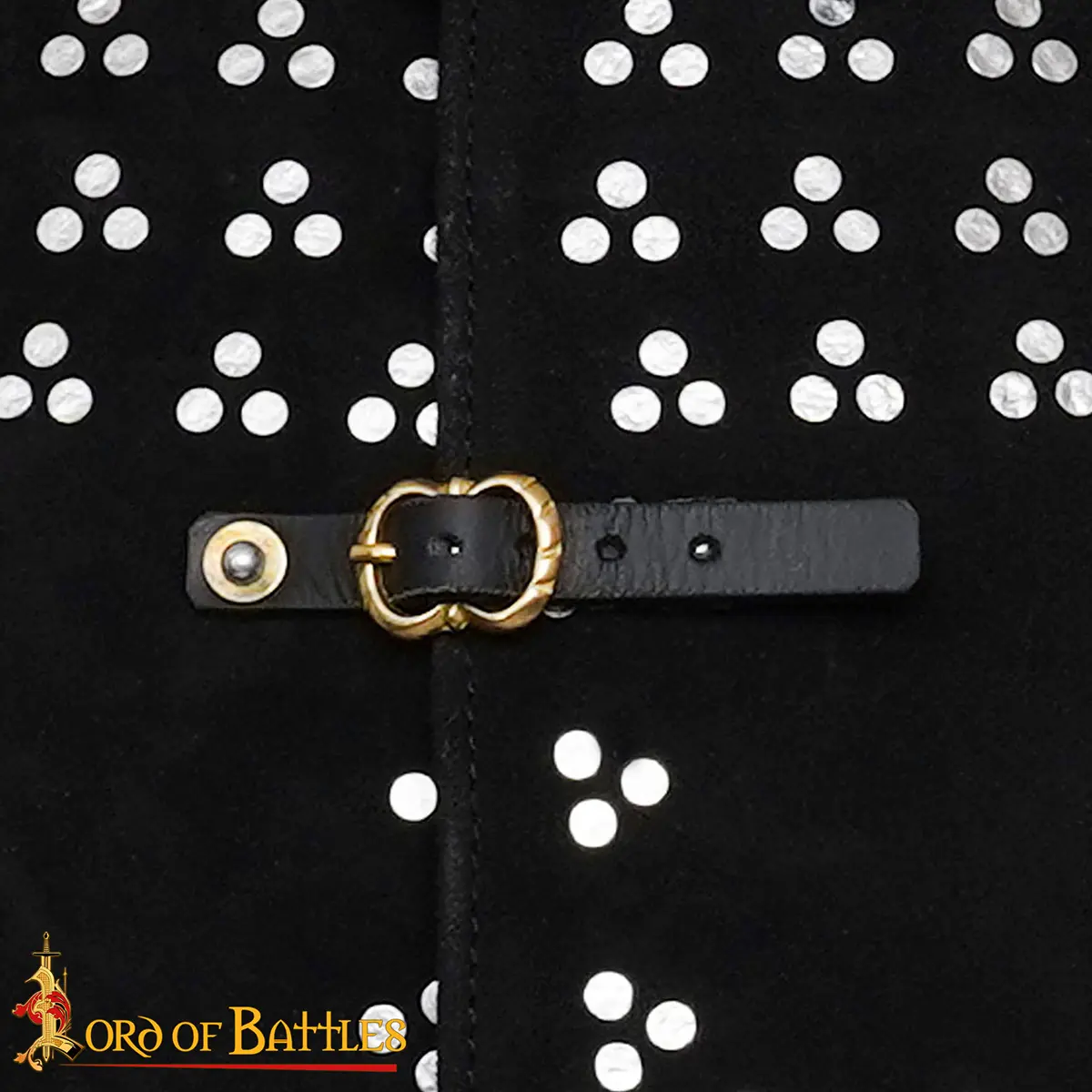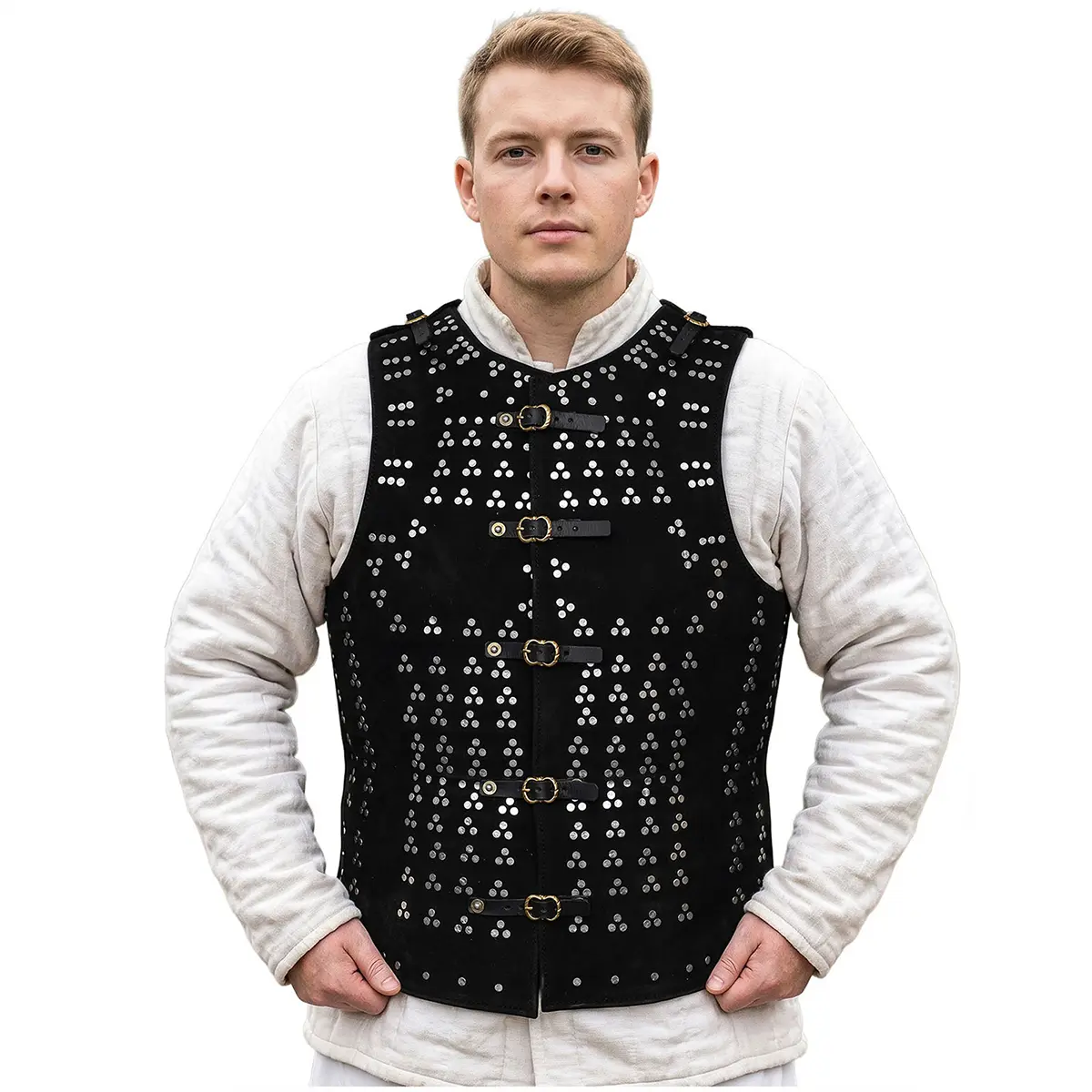 It is crafted from genuine suede leather with a thickness of approx 2 mm, with internal 18-gauge mild steel plates. Depending on size, the plate number varies from 149 and 185 individually riveted plates. These plates are arranged in a true period pattern so that the weight distributes evenly giving freedom of movement.
