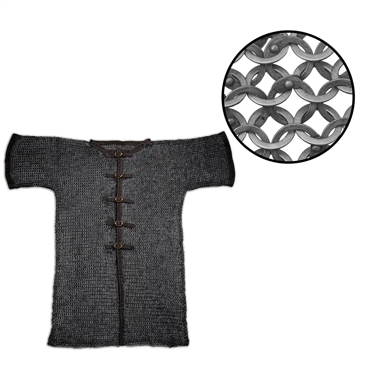 The flat rings improve the strength of the structure, while the riveted construction makes it more secure than basic butted mail. This makes the byrnie suitable for LARP, stage use, and costume wear.