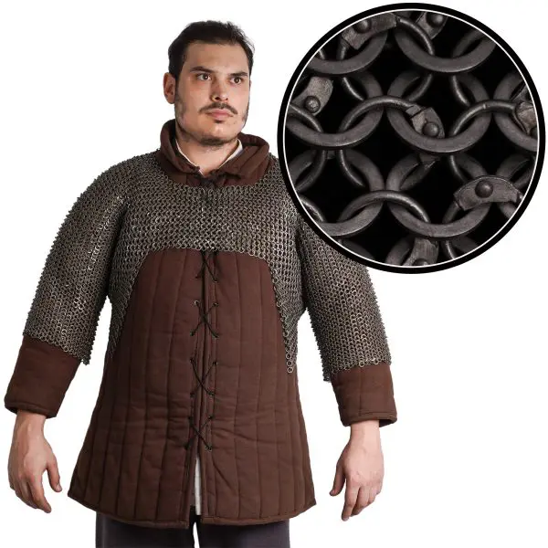 Designed to be worn over a padded gambeson or arming jacket, this half shirt covers the torso, shoulders, and arms, offering solid protection while being lighter and easier to wear than a full hauberk.