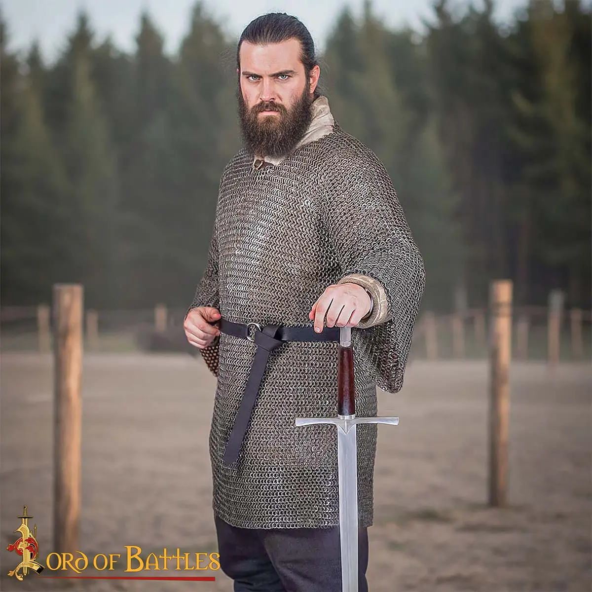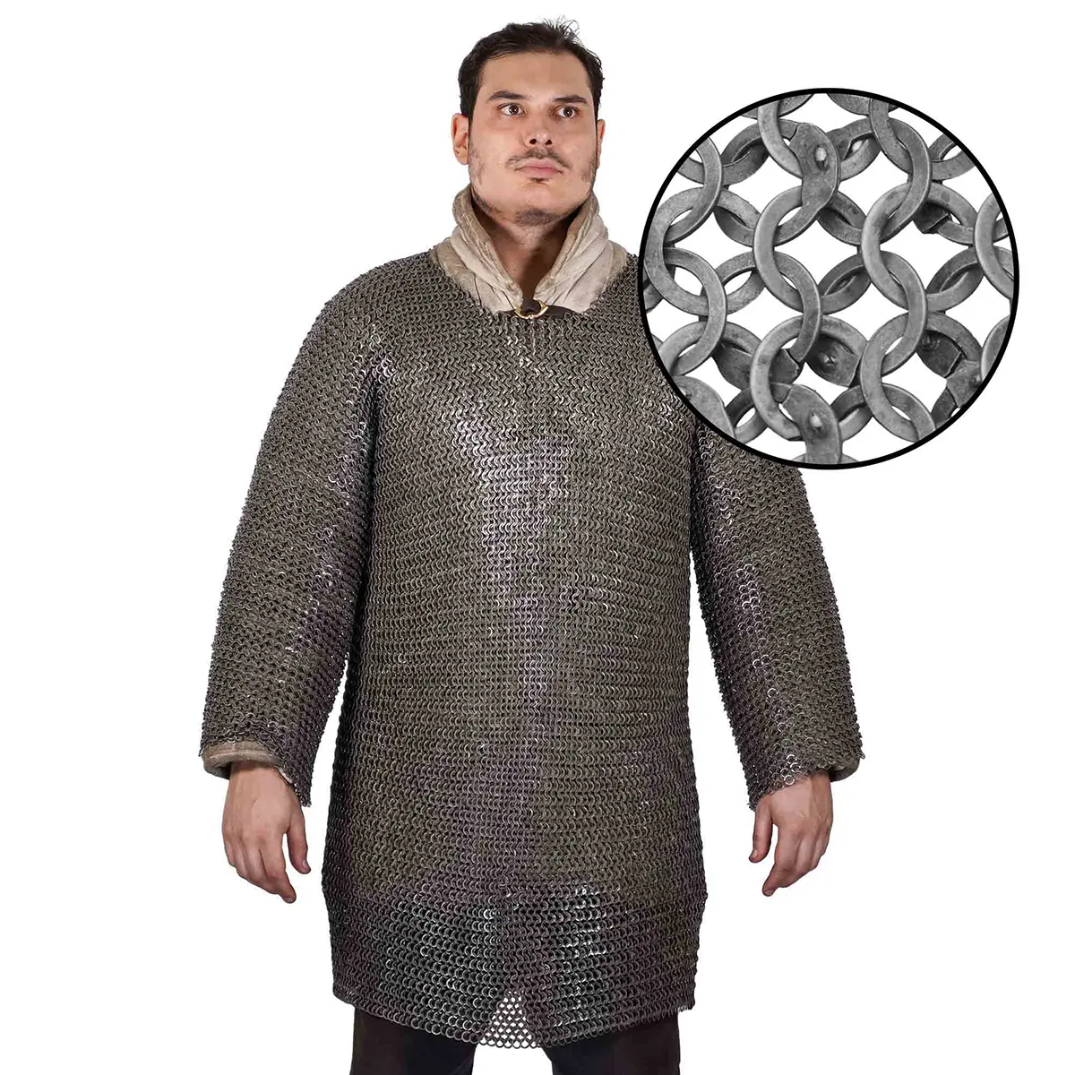 The ingenious incorporation of solid flat rings interspersed among the chainmail enhances its integrity, creating an almost impenetrable barrier against potential threats. Whether you find yourself in the heart of a staged battle or engaging in historical presentations, this chainmail haubergeon serves as an unmatched defense against blows, ensuring that your experience remains authentic and enjoyable.