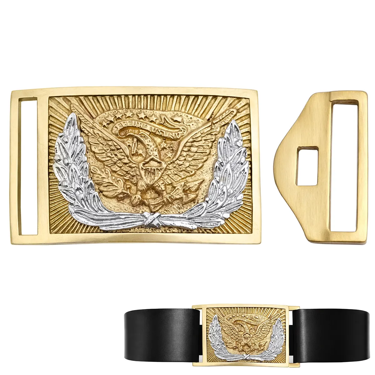The iconic ribbon held in the eagle’s beak inscribed with “E Pluribus Unum” (Latin for Out of many, one), speaks to the profound ideology that unites the diverse facets of American society. This buckle isn’t merely worn; it is proudly displayed as a testament to unity, courage, and history. Further embellishing this remarkable piece are NICKEL-PLATED WREATHS, intricately encircling the emblem, symbolizing victory and honor.