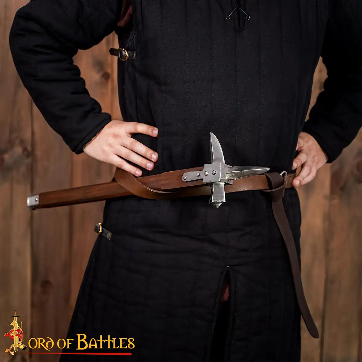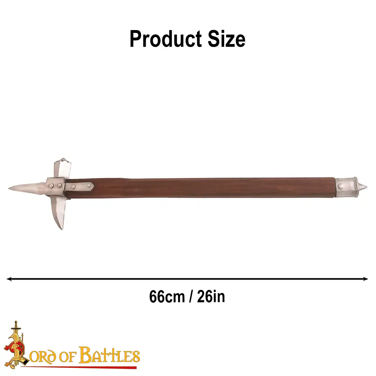 Crafted with the utmost attention to detail, the hammerhead and spikes are made from durable, high-quality carbon steel, ensuring longevity and presentation befitting an authentic historical piece. The handle is fashioned from elegant teak wood, providing a balance of strength and aesthetic appeal. Measuring approximately 66 cm in length, this war hammer is not only a formidable piece of history but also a striking decor accessory. Whether displayed in a medieval-themed bar, a personal collection, or as a centerpiece in a contemporary home, this hammer is designed to ignite conversations and intrigue.