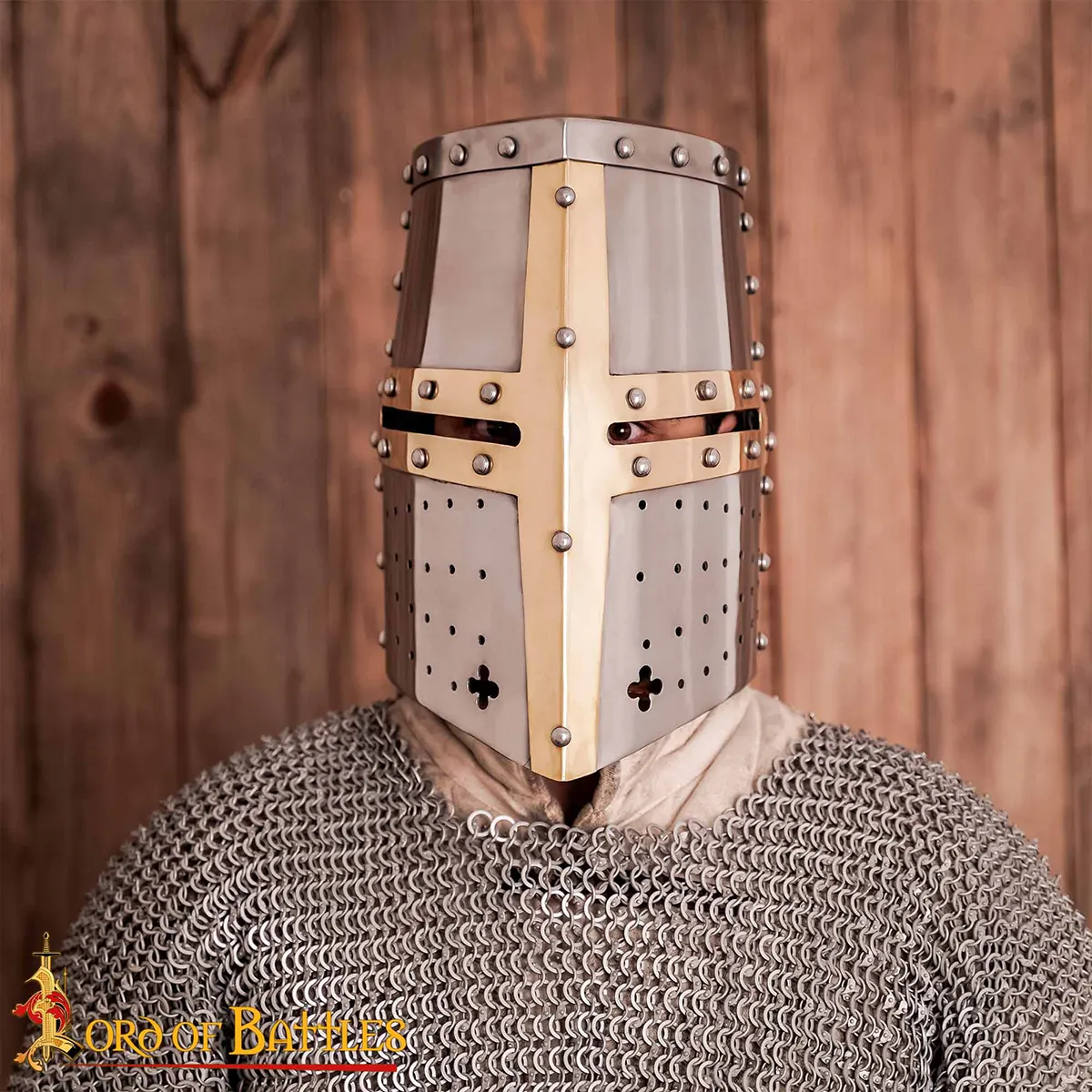 Unlike simpler helmets of the period, this model is distinguished by its riveted brass cross on the face plate, a bold declaration of devotion and a functional reinforcement against weapon strikes. The perforated mouth plate provides breath ability, while the 16 gauge steel construction ensures superior impact resistance compared to lighter replicas.