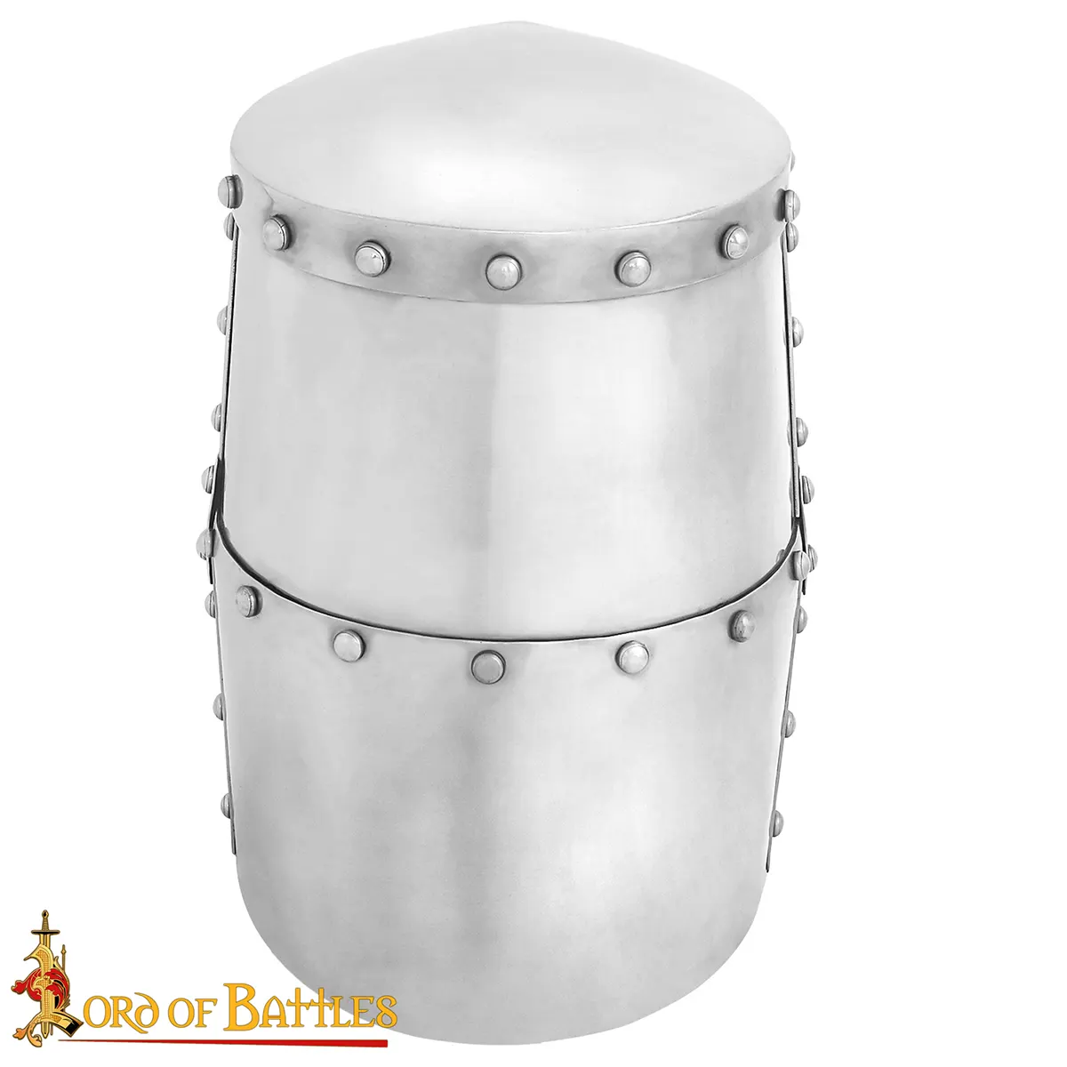 Step into the legendary age of the Crusades with this Crusader Knight Pot Helm, a battle-ready reproduction of the great helms worn by mounted knights of the Holy Orders in the 12th and 13th centuries. Designed for full-face protection and an imposing battlefield presence, this helm embodies both faith and strength.