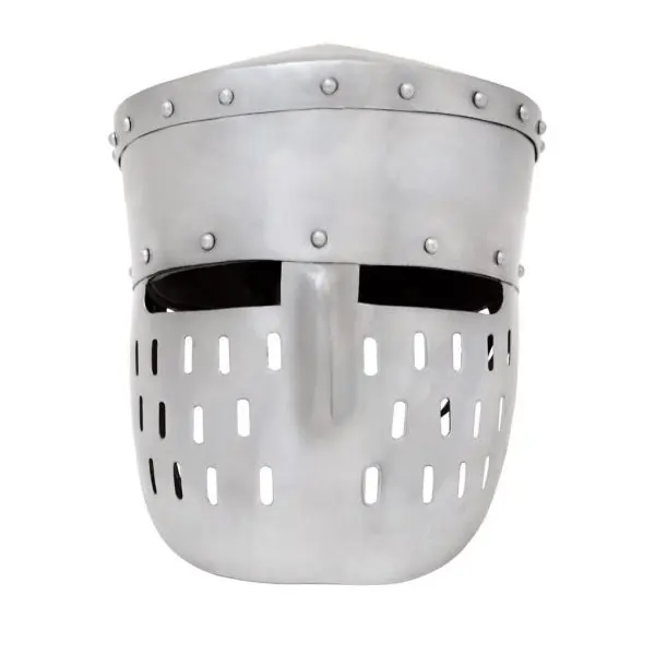 Inspired by an original seal from the British Museum, our Crusader Knight Steel Helmet features thoughtful modifications, including innovative ventilation holes that keep you cool and comfortable. As knights evolved, they recognized the necessity of face protection against the devastating effectiveness of the couched lance technique. The transition from nasal helmets to those featuring a protective faceplate was revolutionary, providing essential safety against mounted opponents and archers alike.