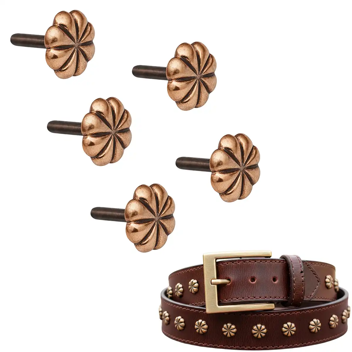 These mounts work perfectly as metal rivet studs for belts, leather armor, bags, and restoration projects. They can also be used as a metal stud rivet detail on costumes or as bronze studs for historically inspired accessories. Their refined shape makes them suitable for decoration bronze applications and classic rosette decoration designs.