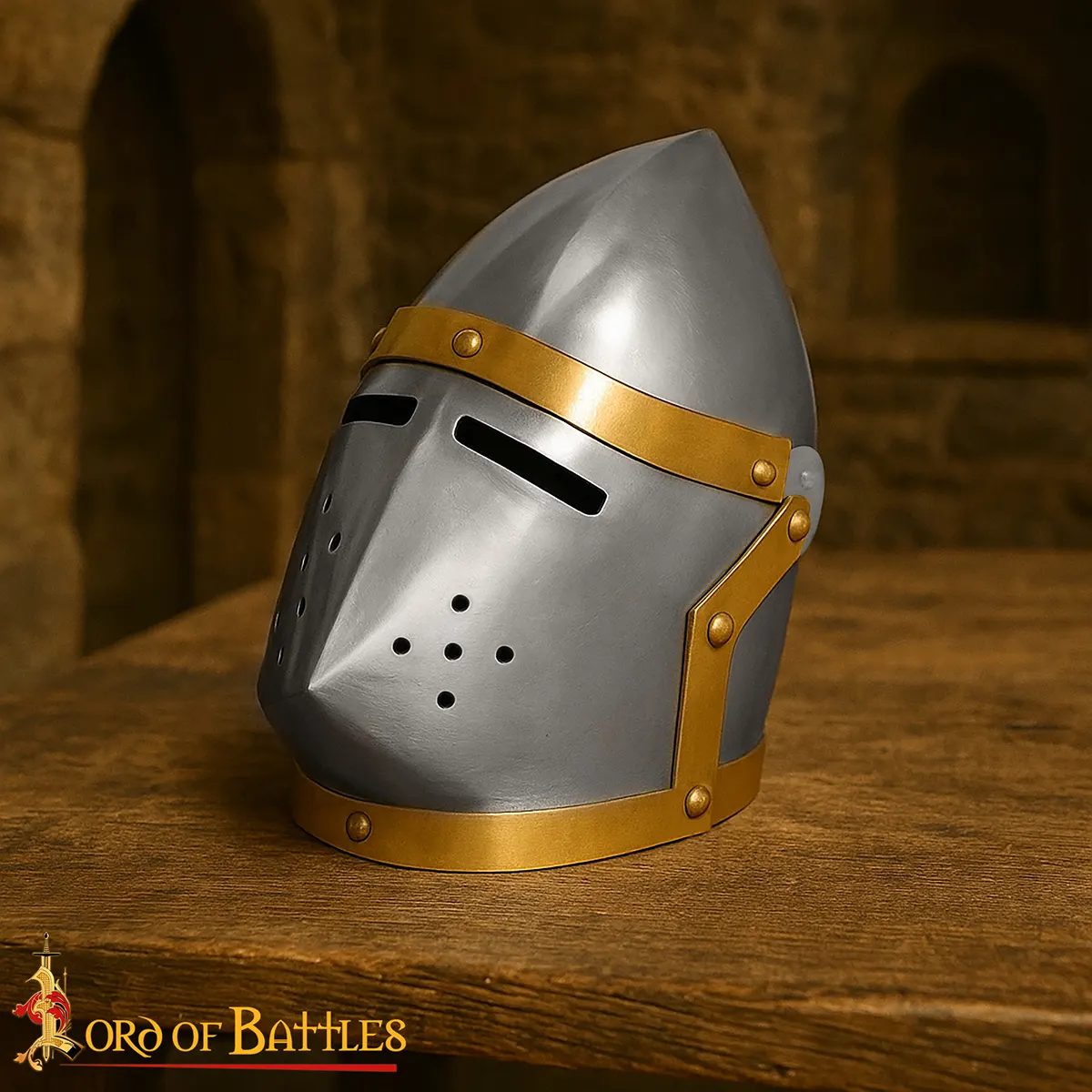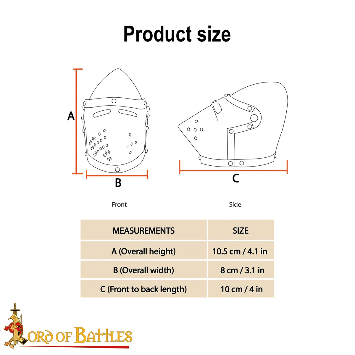With elegant pure brass detailing, each element of this Bascinet mini helmet showcases a level of craftsmanship that is rare in today’s market. You can appreciate the artistry in every curve and line, reflecting the spirit of the historical period from which it hails. Measuring approximately 8.7 cm in length and 13.5 cm in width (with the visor securely closed), this miniature replica is not just a decorative piece; it embodies historical significance and artistic genius in a compact form.