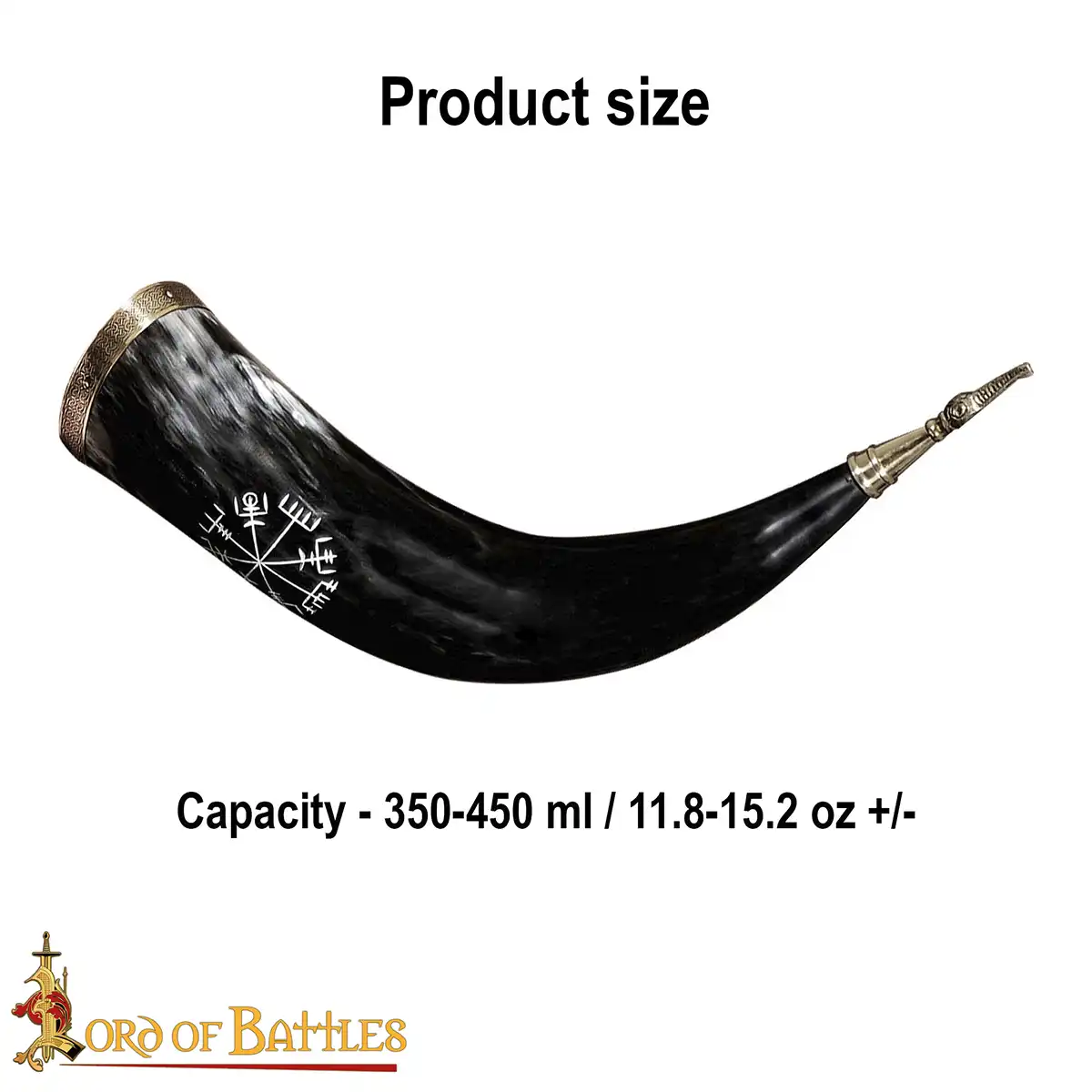 This ale drinking horn is handcrafted from ethically sourced ox horn and has beautiful brass accents with its rim and tip made from pure brass. It has a hand engraved Vegvisir rune which is a symbol that means guidance and safe journey in the Norse tradition. The horn is hand finished and polished inside out to make it smooth for your drinking use. It is suitable for room temperature and cold beverages as hot temperature may cause the horn to develop cracks. Each horn has its own natural curve and surface which gives it a beautiful medieval look shaped by nature itself.