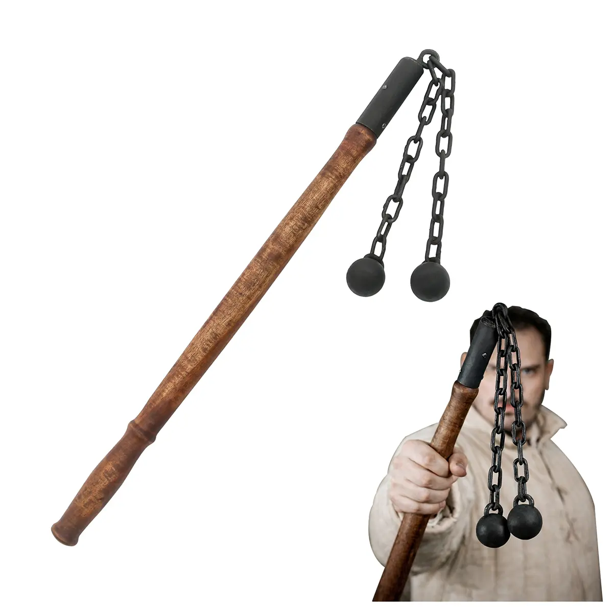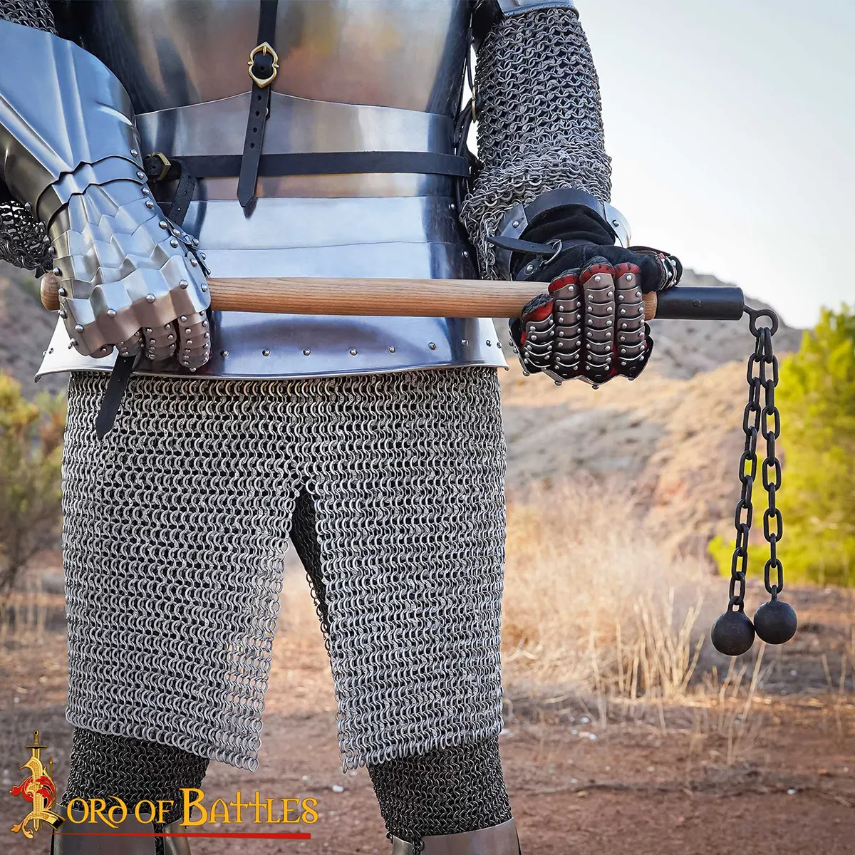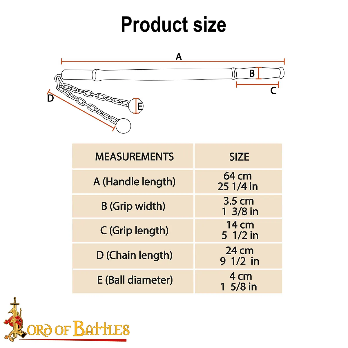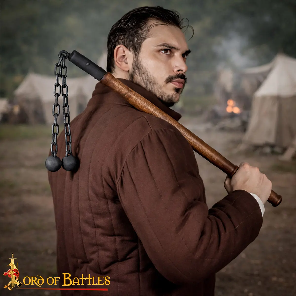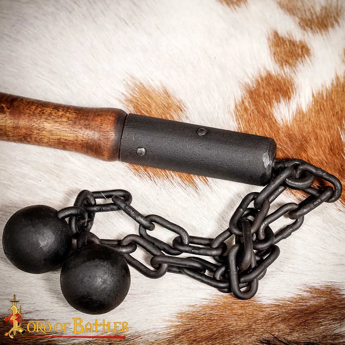 Step into the brutal world of medieval warfare with this Double-Ball Battle Flail, designed to unleash devastating force. The 25-inch hardwood handle, strengthened with an iron collar, connects by chain to two heavy iron heads, crafted to swing with crushing momentum that no shield could ignore.