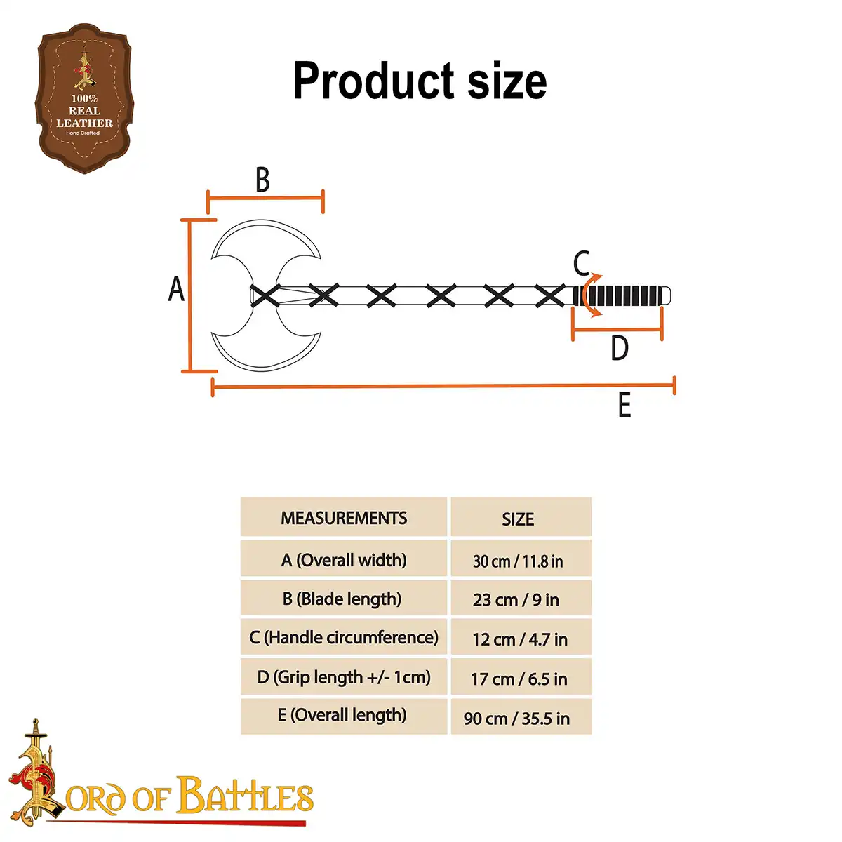 The TOTAL LENGTH of the axe measures approximately 35.8 inches, perfectly proportioned for both practicality and aesthetic appeal. Not only does it embody a fierce aesthetic, but it also serves as a fully functional Viking weapon, ideal for historical reenactors, collectors, and LARPing enthusiasts.