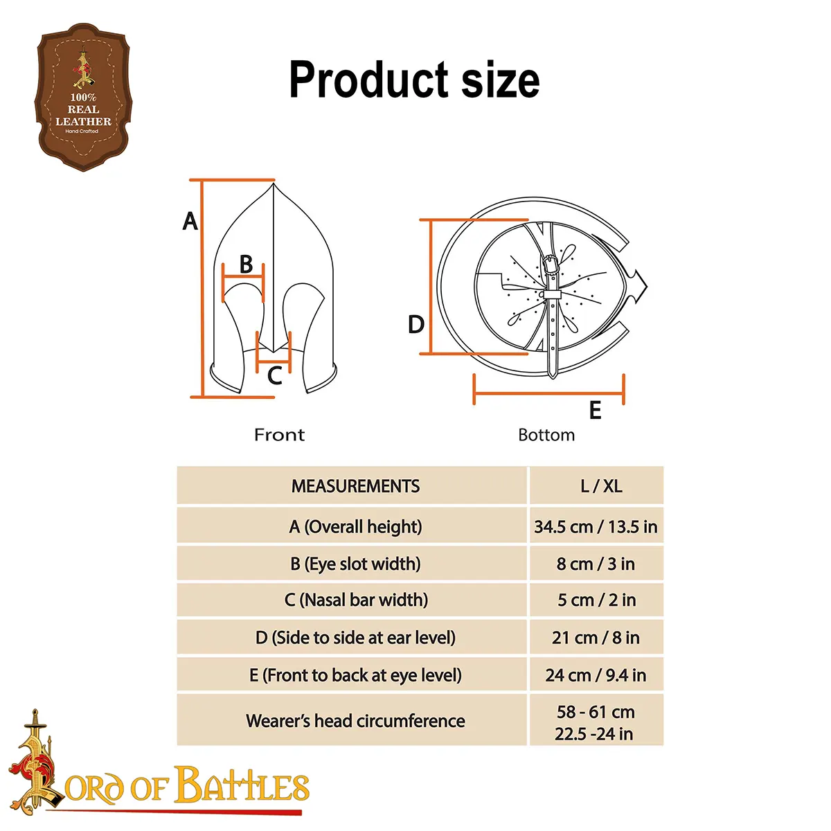 This helmet has impressive dimensions that cater to various head sizes. With a height of approximately 34.5 cm, an interior depth of around 24 cm, and an inner width of about 20 cm, it has been tailored for comfort without compromising on protection. The eye space is generously sized at 8 cm, ensuring that your line of sight remains clear while you navigate through any fantasy realm. With an inner circumference of 68 cm prior to the attachment of the leather liner, this helmet fits most head circumferences between 58 cm and 61-62 cm.