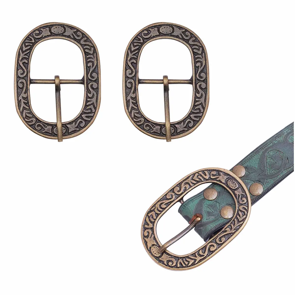 Each buckle is made from sturdy brass, then finished with an antique patina that shows the engraved floral artwork. The engraved motifs of the medieval belt buckles give depth and character which make any outfit stand out. The oval shape and solid prong make these buckles both visually striking and reliable for regular use.