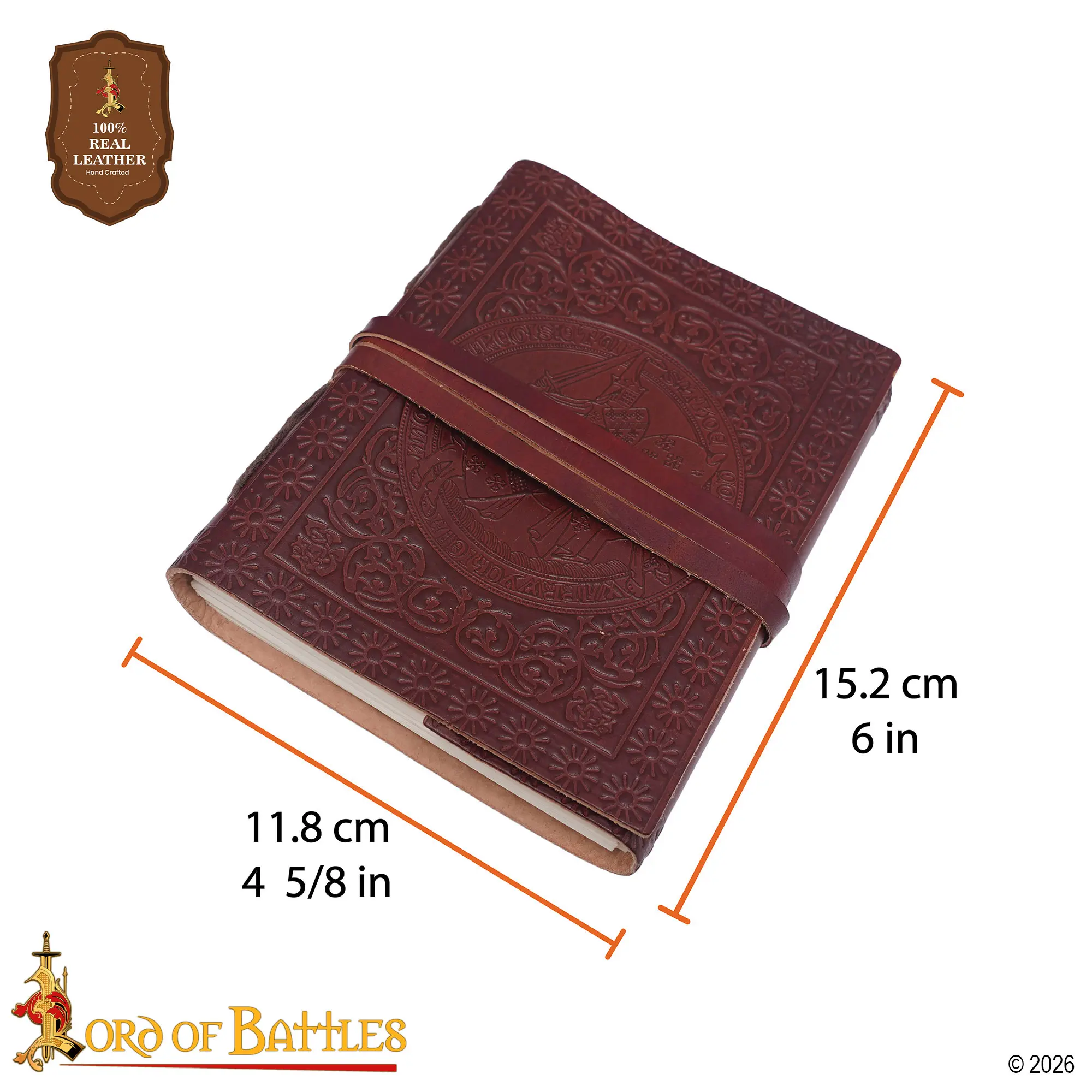 Measuring 7 x 5 inches, this compact leather bound journal is easy to carry in a bag or pouch. It is perfect for travel, fairs, LARP events, or daily use. Whether used as a notebook, diary, or vintage travel journal, it is practical while keeping a historical look.