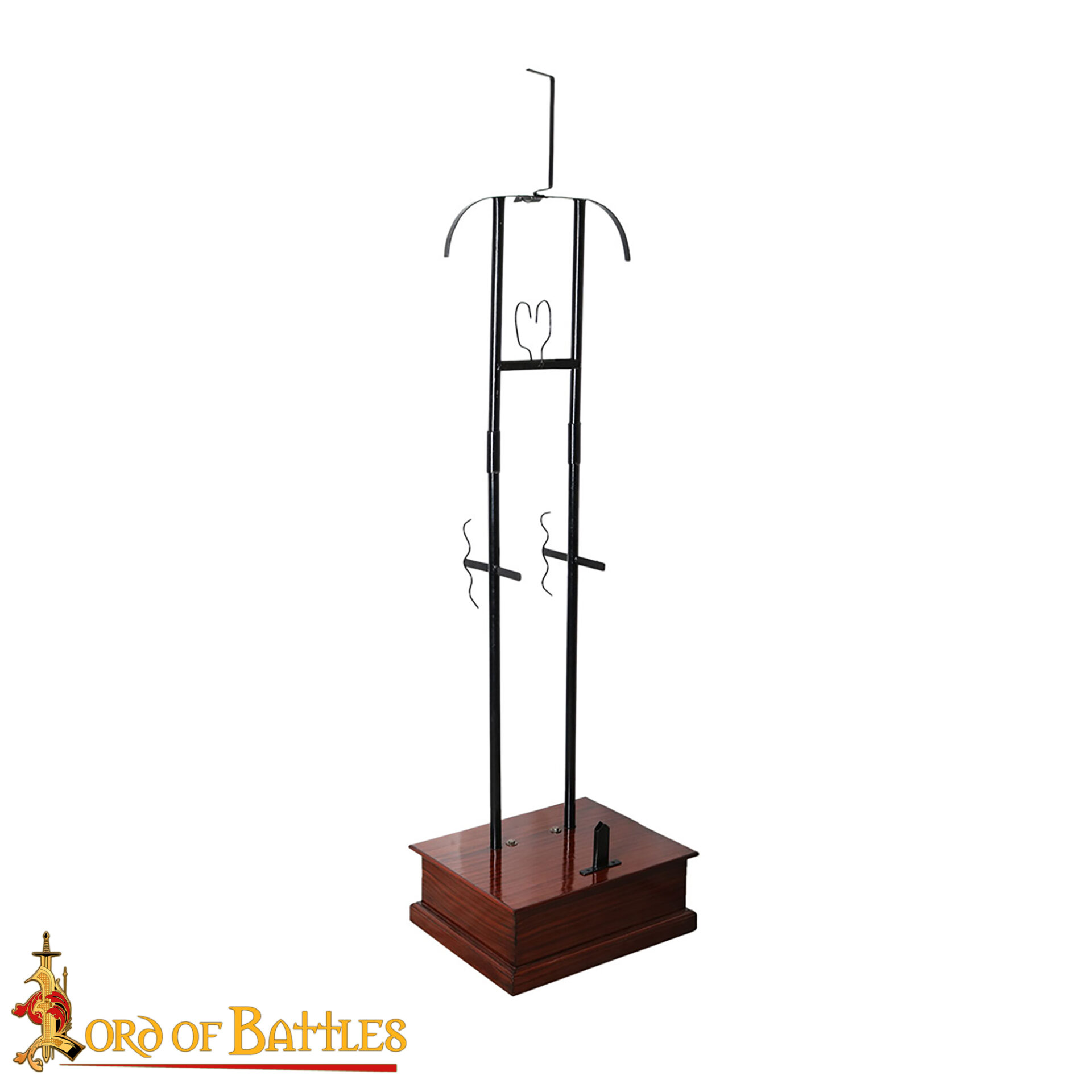 The standout feature of this display is its genuine hardwood base. This solid foundation ensures that the stand remains firmly anchored, preventing any wobbling or toppling over. So whether you’re showcasing a knight’s armor in your den, living room, or perhaps a dedicated medieval space, you can be confident that your display is safe and spectacular. The base complements the steel structure beautifully, offering a striking contrast that enhances the overall visual appeal of the display.