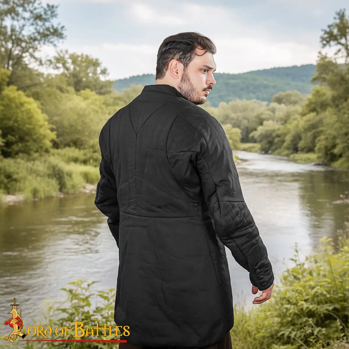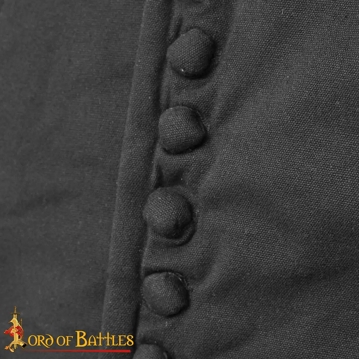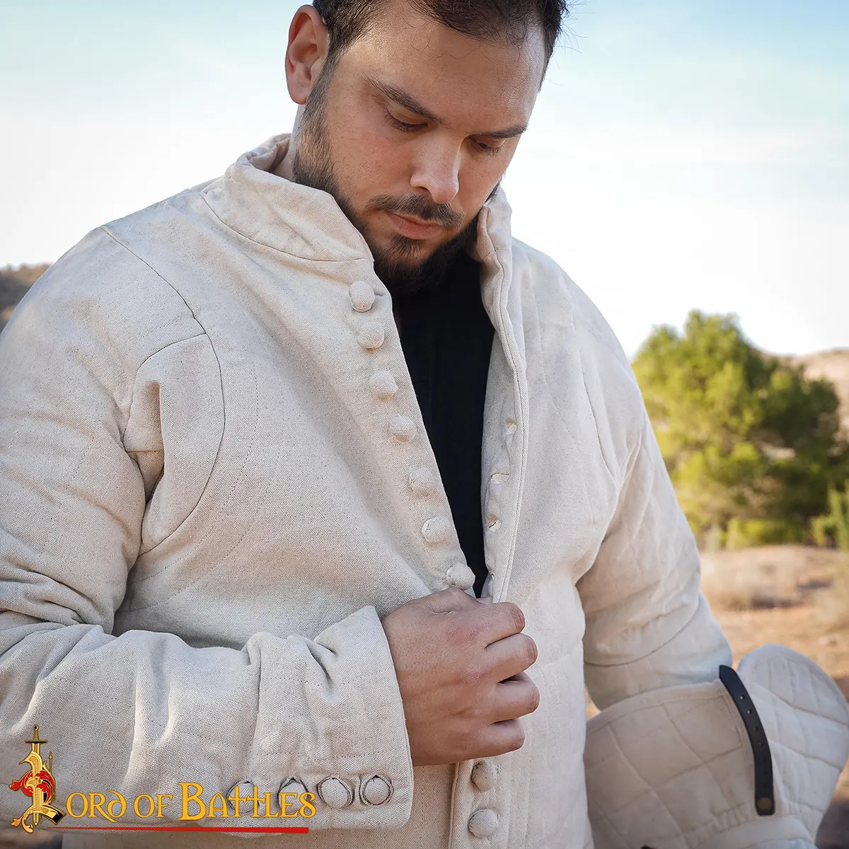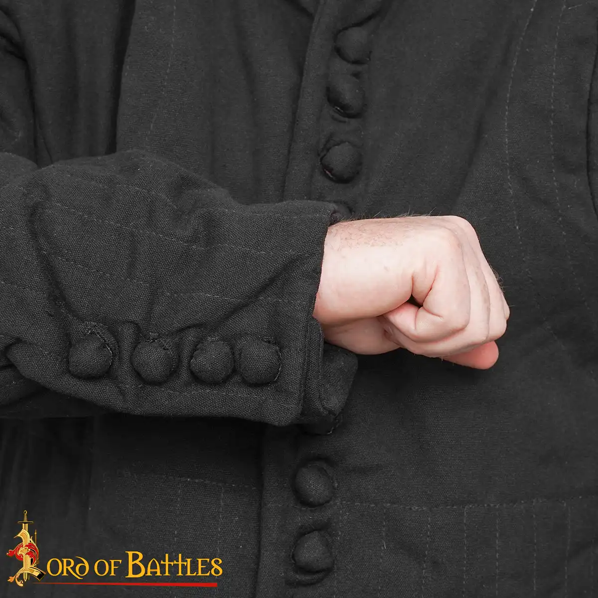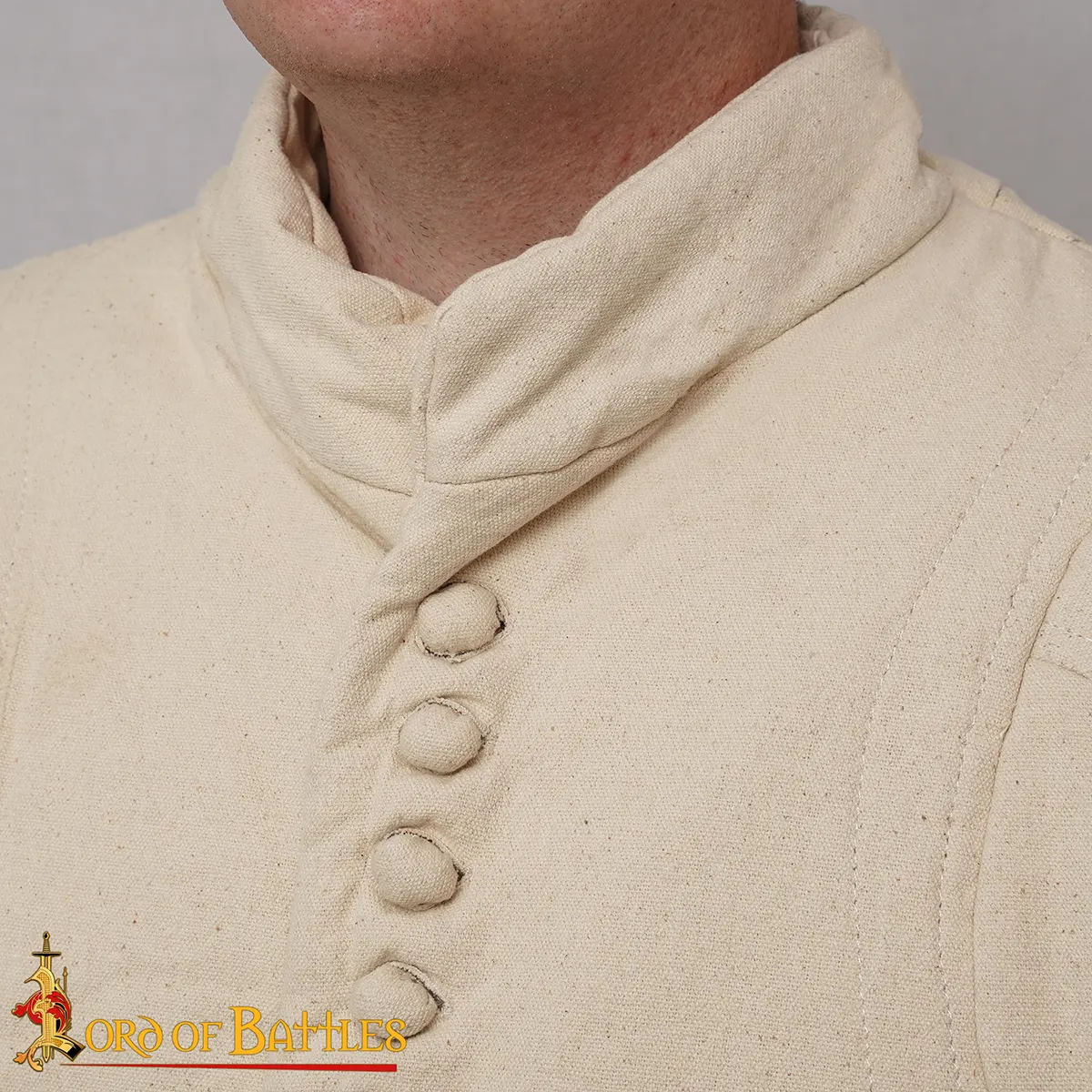 The buttoned front gives an adjustable fit and adds to the garment’s historical character. The raised, padded collar improves neck protection, while the vertical channels keep the internal padding from shifting during activity.