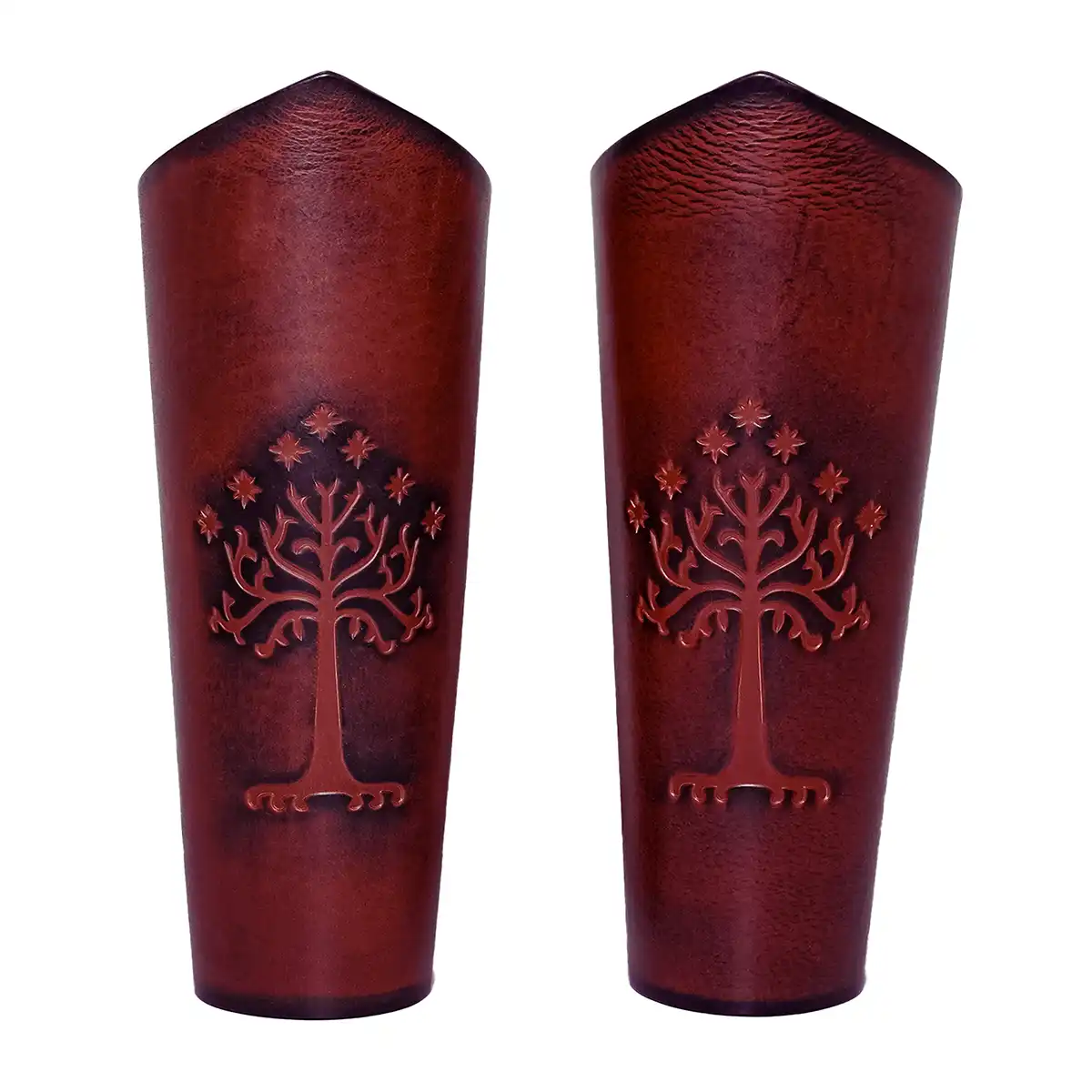 Crafted with precision, these bracers are made from ETHICALLY SOURCED LEATHER, ensuring not only durability but also a commitment to sustainability. Each piece is meticulously handcrafted, making it a unique addition to your gear. The intricate embossing features the White Tree of Minas Tirith, representing nobility and resilience, alongside the seven stars emblematic of Gondor’s proud flag, a true testament to your unwavering spirit as a formidable ranger.