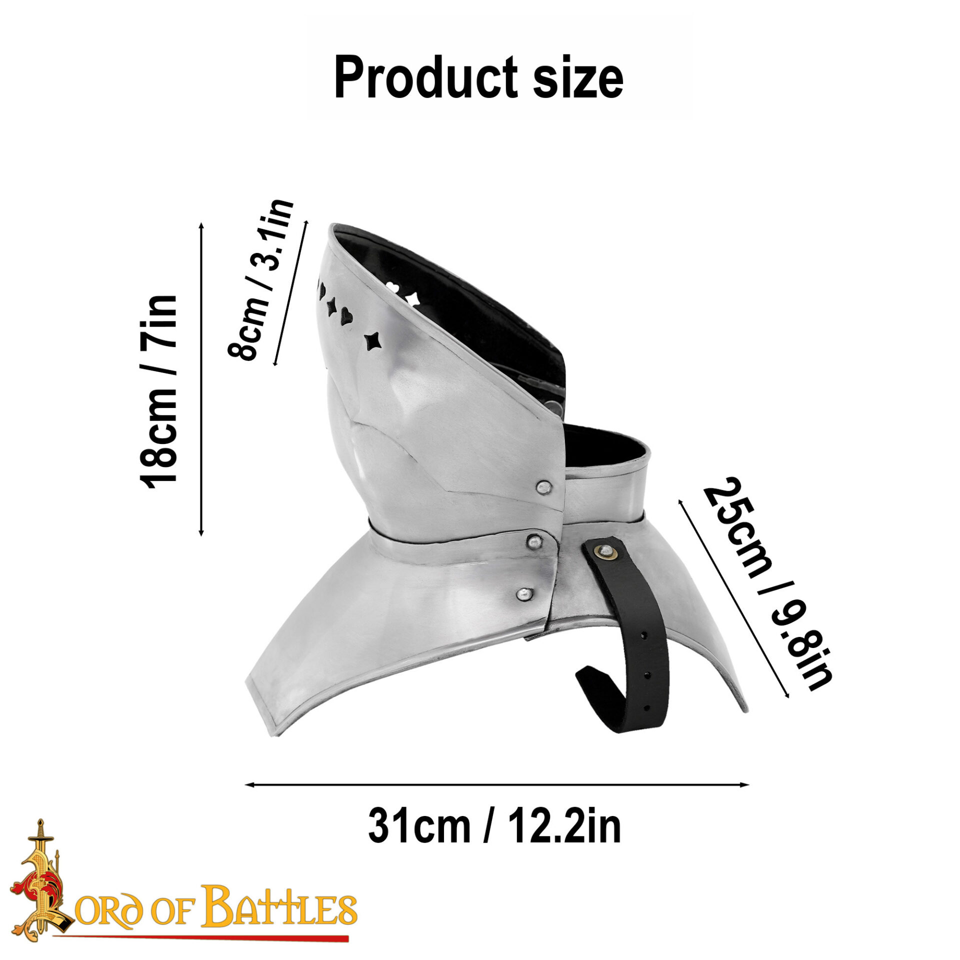 Each bevor is handcrafted by skilled armorers. Small variations in size, symmetry, or surface finish are normal and add to the uniqueness of every piece.