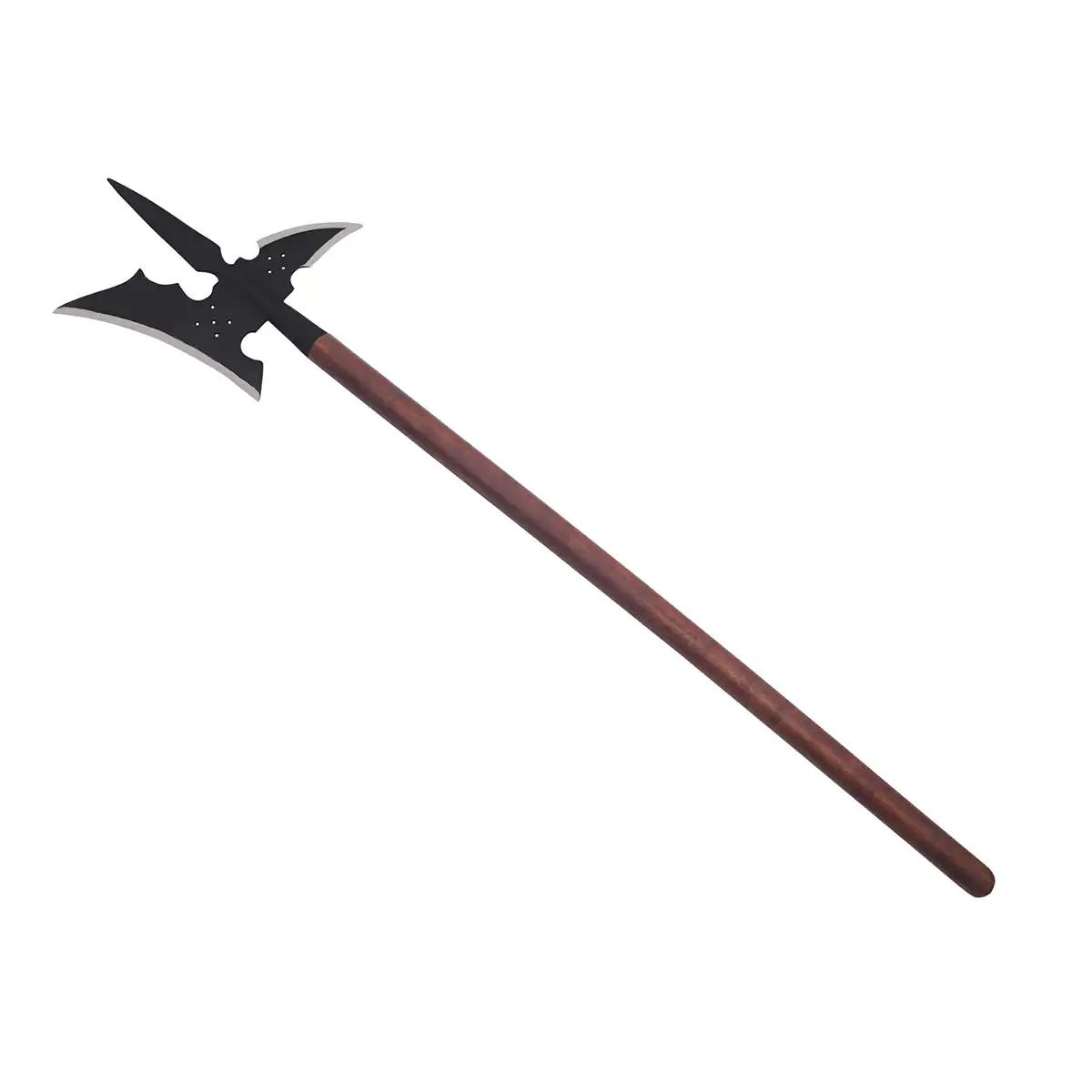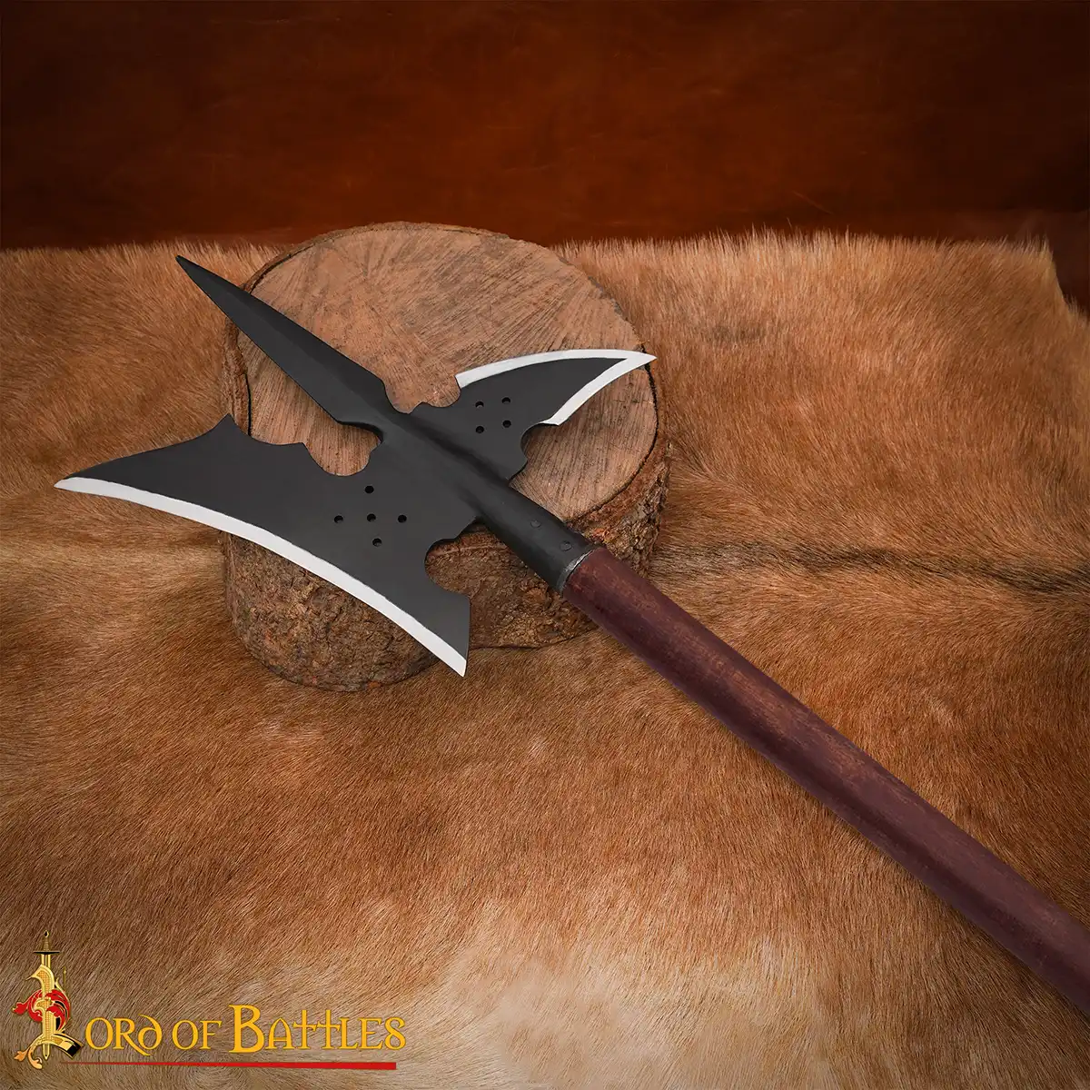 The head is hand-forged from carbon steel and polished cutting edges, for a battle-worn as well as a refined look. Its multi-purpose design includes a spear tip for thrusting, dual axe blades for cutting, and a side fluke for hooking, pulling, or disarming opponents. This versatile design bridges the evolution between the medieval axe and spear-based weapons, and gave one both cutting and piercing capability.