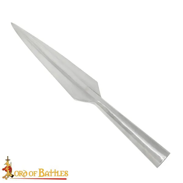 This exceptional spearhead is made from sturdy carbon steel, ensuring durability and a sharp edge that will stand the test of time. With a total length of approximately 43.5 cm, it strikes the perfect balance between maneuverability and power, making it suitable for various applications such as decorative displays, reenactments, or even practical use in outdoor activities. The spearhead’s thoughtfully designed socket features an inner diameter of 3 cm, allowing for compatibility with a range of spear shafts, so you can customize it to your specifications.