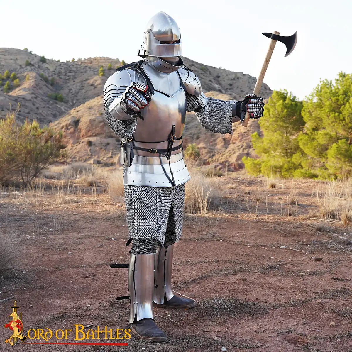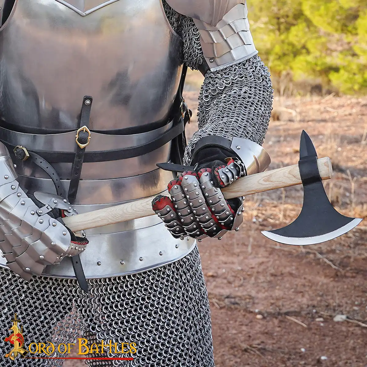 The handle is hewn from premium wood, long prized across ages for its durability and flexibility. It absorbs shock with ease while remaining light in the hand, granting both balance and control. Smoothly finished yet rugged in nature, it offers a steady grip, whether the axe is raised for combat practice, carried into a LARP adventure, or hung as a proud display piece.