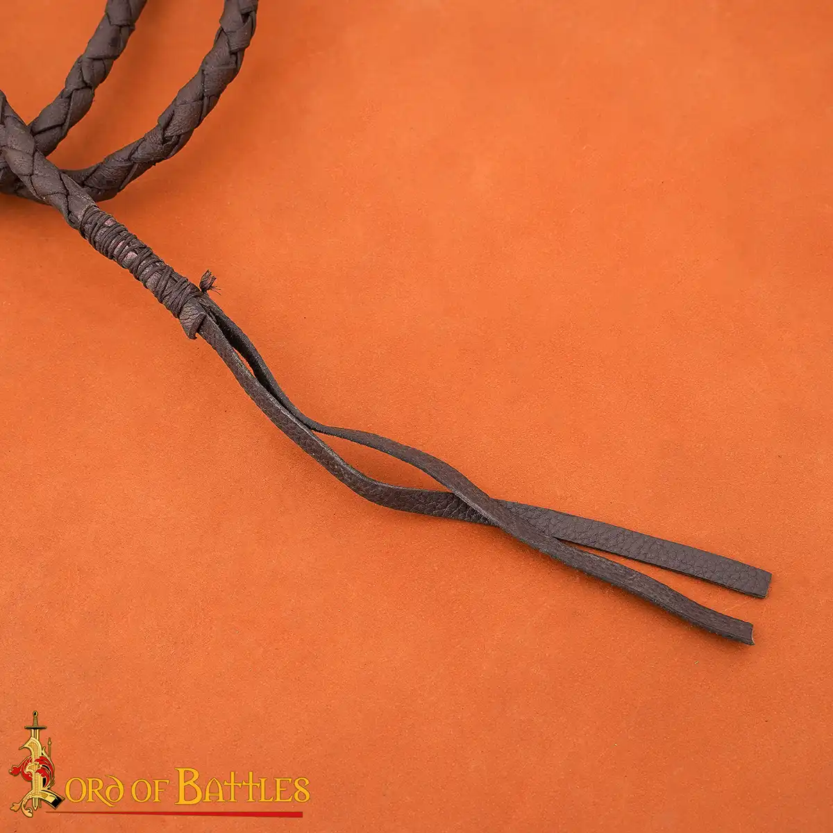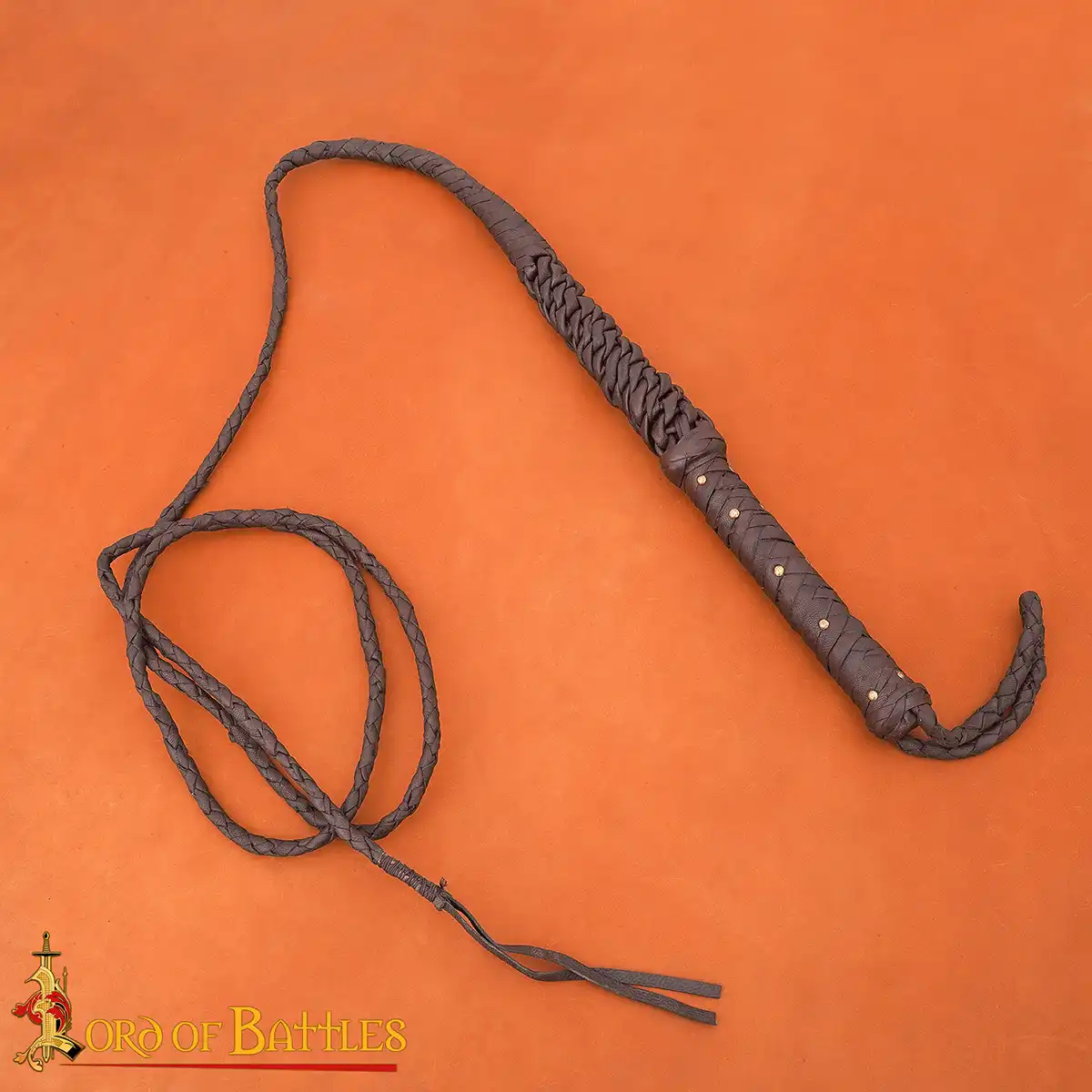 Step into the world of medieval performers, explorers, and artisans with this handcrafted leather bull whip. Braided entirely by hand from genuine leather, it has a supple texture that coils easily and handles smoothly. The reinforced handle, finished with brass rivets, adds both strength and a touch of classic medieval character.