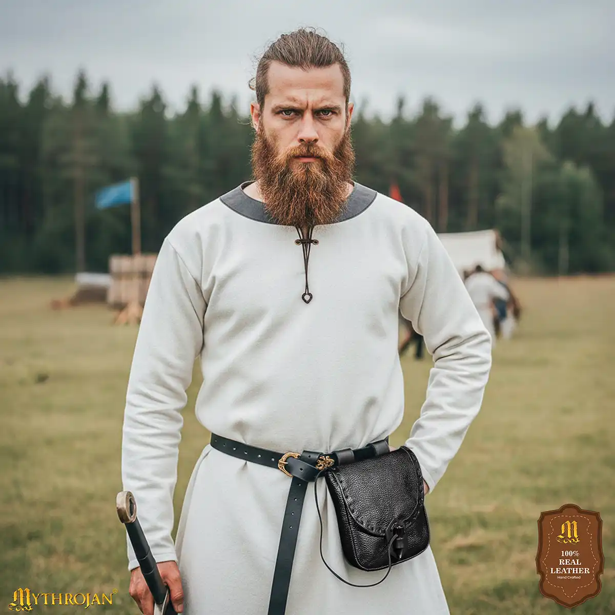The bag has spacious storage for daily essentials such as coins, keys, dice, cards, or even a phone. Weighing about 240 g, it is sturdy and comfortable for long wear. The reinforced belt loops fit belts up to 6.5 cm, making it ideal for LARP, Renaissance fairs or daily use. Over time, the leather will develop a rich natural patina, giving your bag a unique aged look.