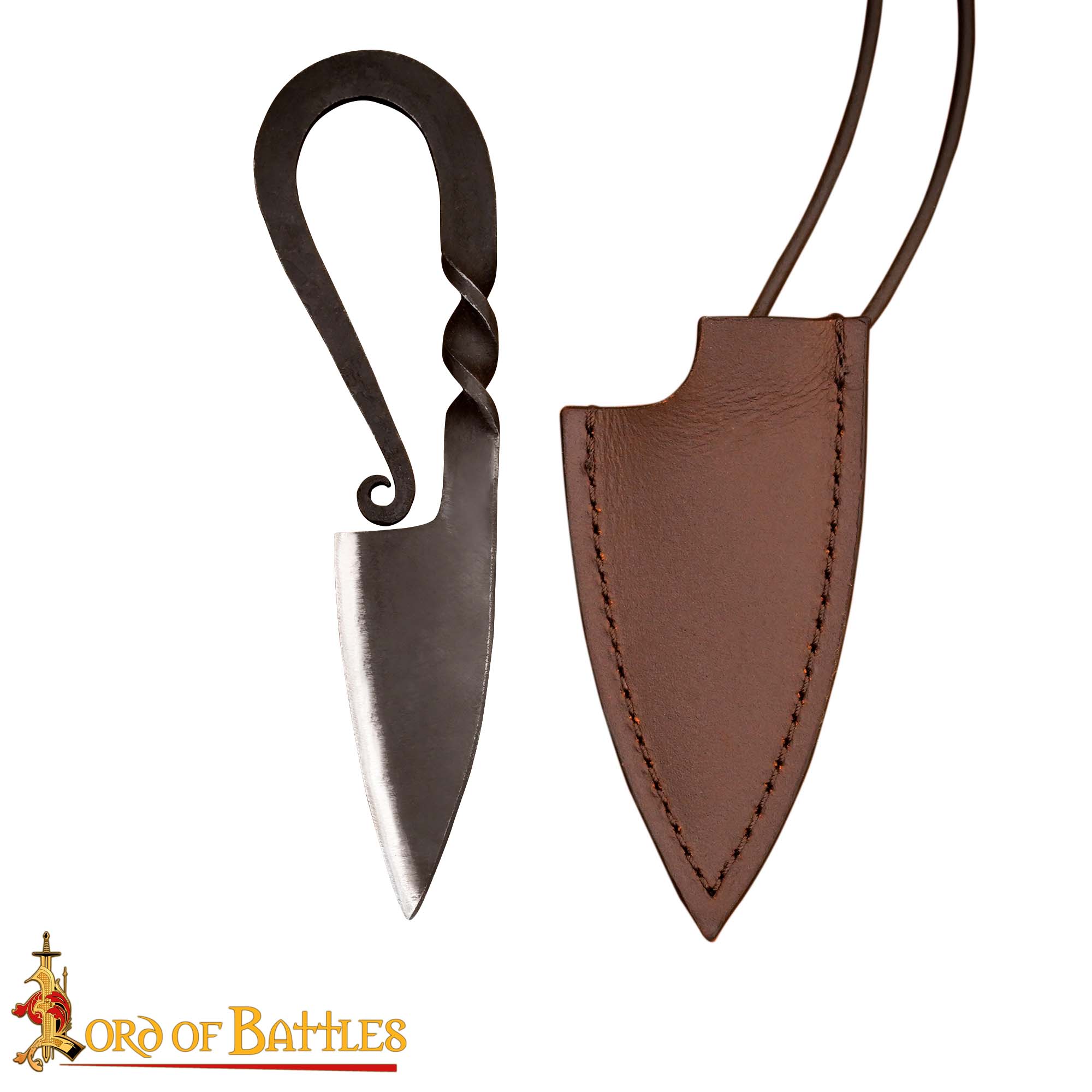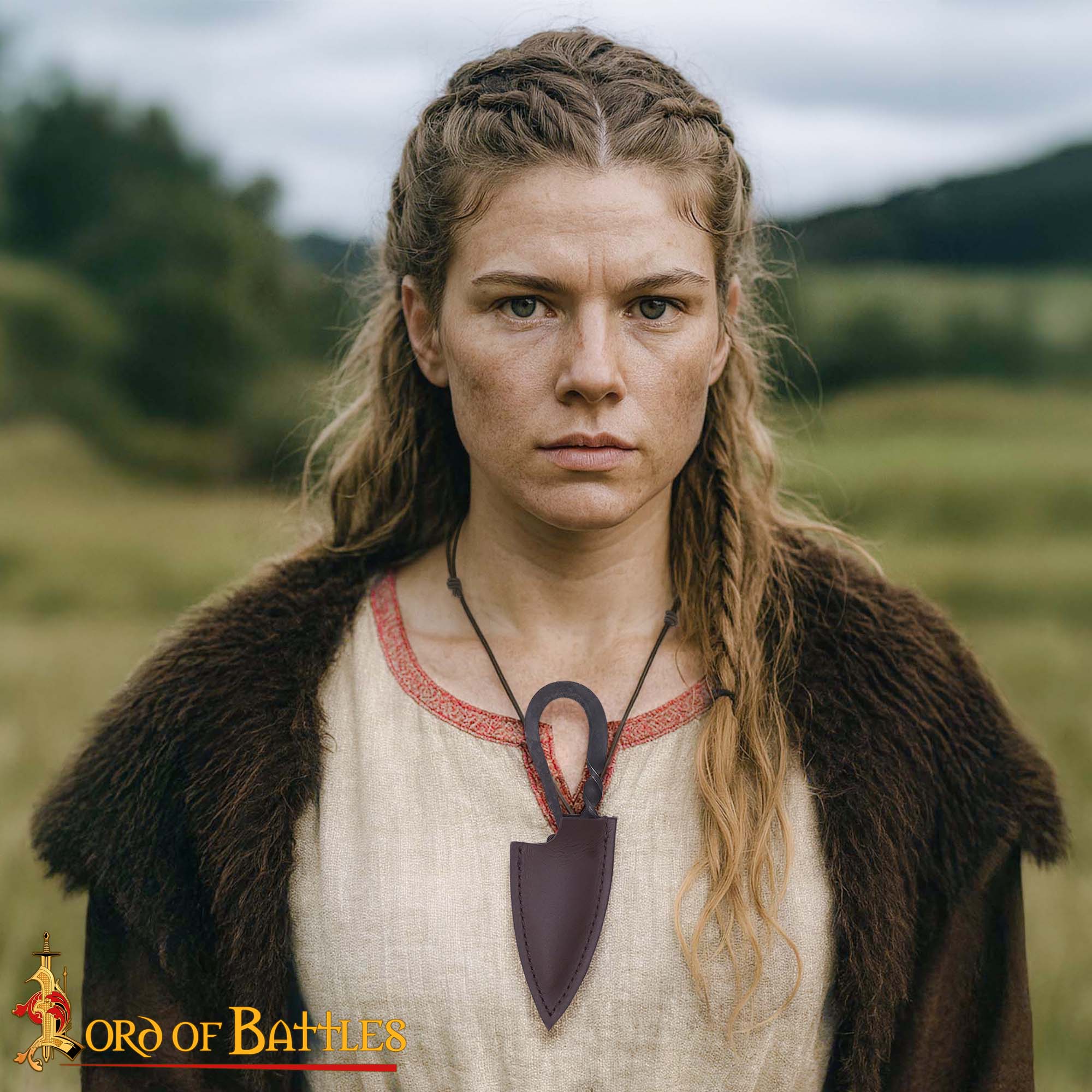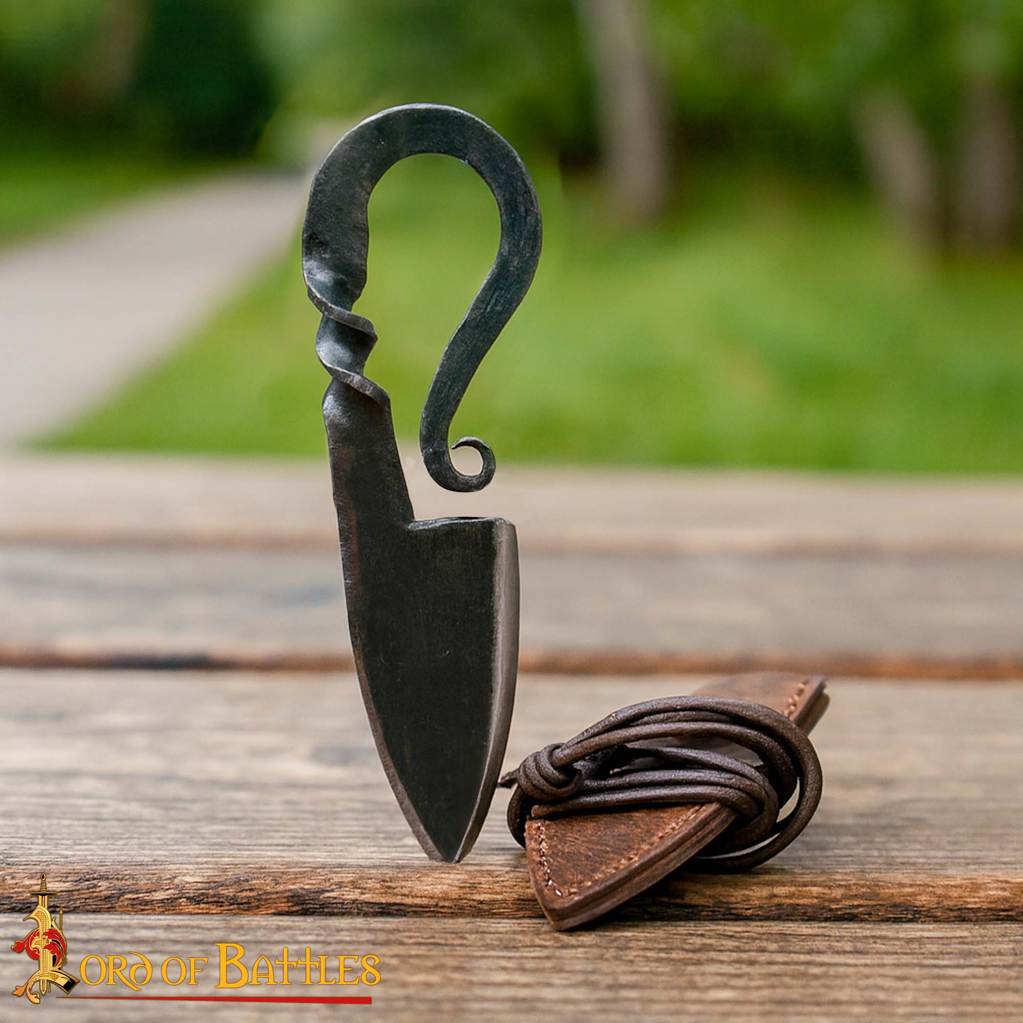 The knife is paired with a genuine leather sheath, crafted to protect the blade and add historical authenticity. The sheath features an adjustable leather cord, allowing it to be worn around the neck for both convenience and style—keeping your blade close at hand during adventures, gatherings, or LARP events.