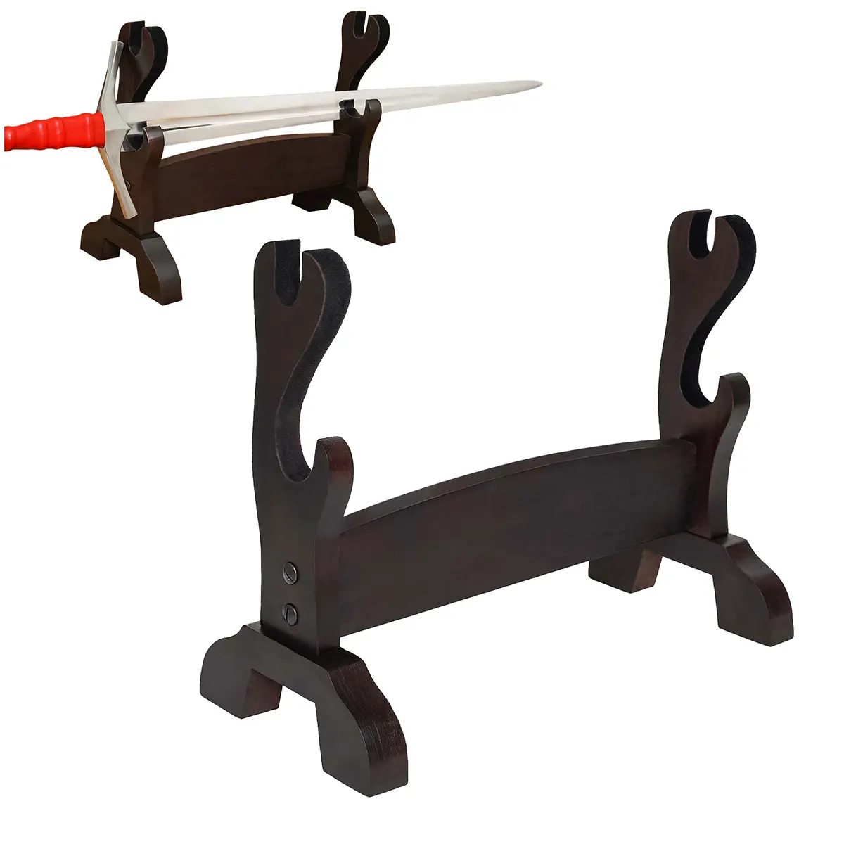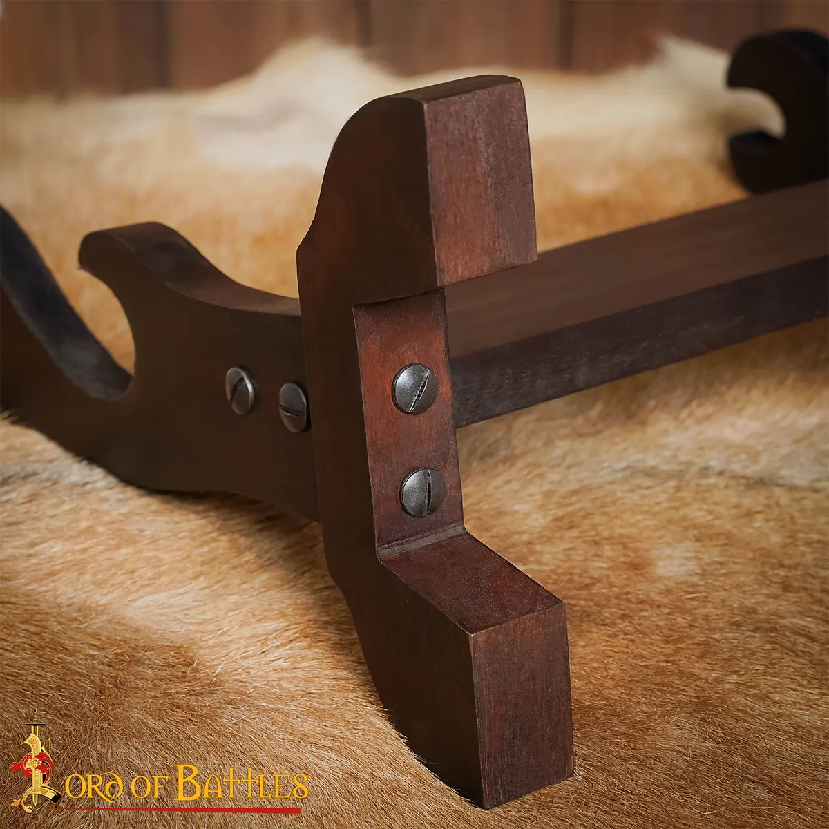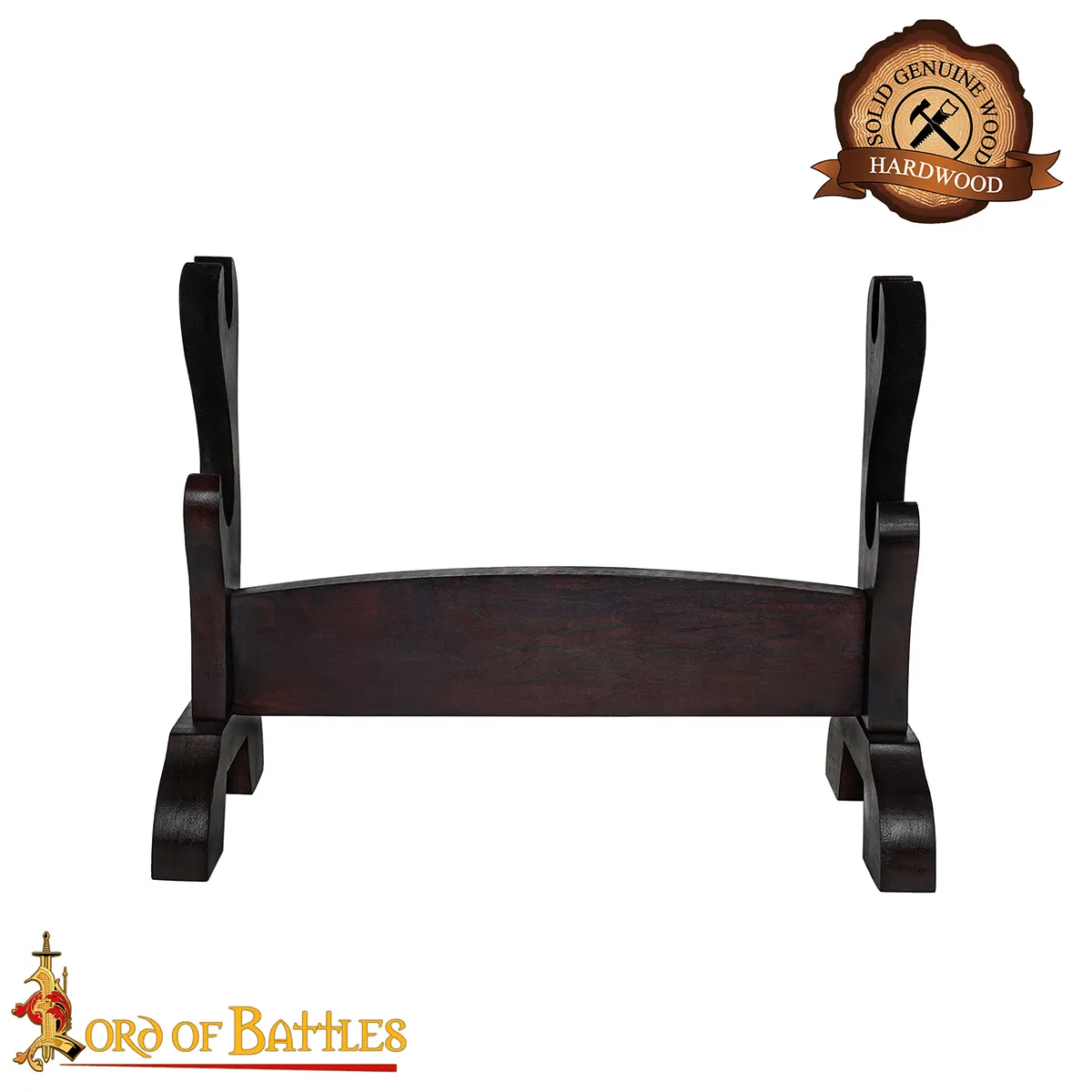 Made from solid hardwood with a rich dark finish, this stand has two smooth cradles that keep your weapons safe and prevent scratches. Its flexible design makes it perfect for medieval swords, katanas, axes, or other collectibles you value.