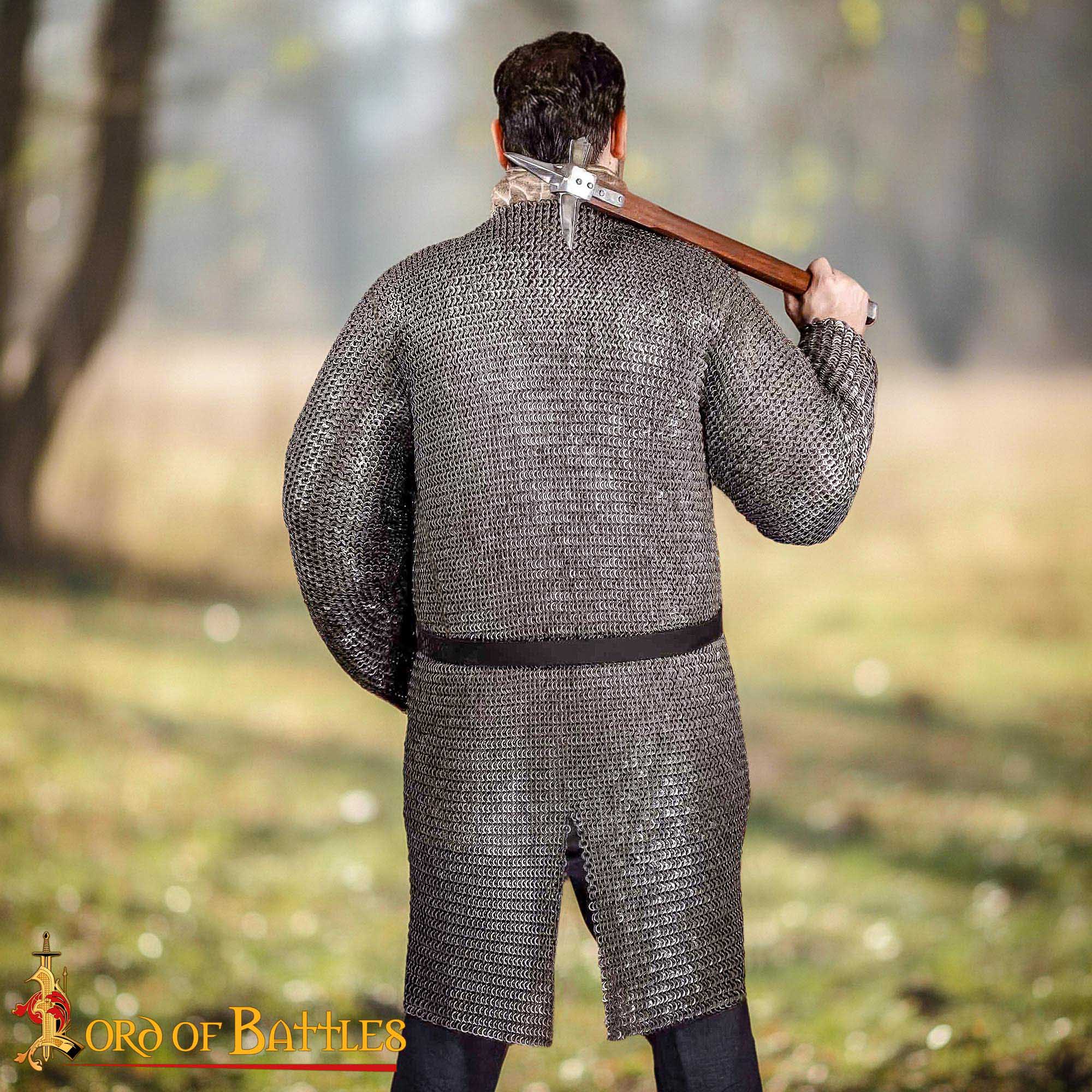 The natural oiled finish of the Chainmail Hauberk increases its authentic appearance and provides basic protection against rust. With knee-length coverage and long sleeves, it provides excellent defense for reenactors, medieval fighters, and history enthusiasts.