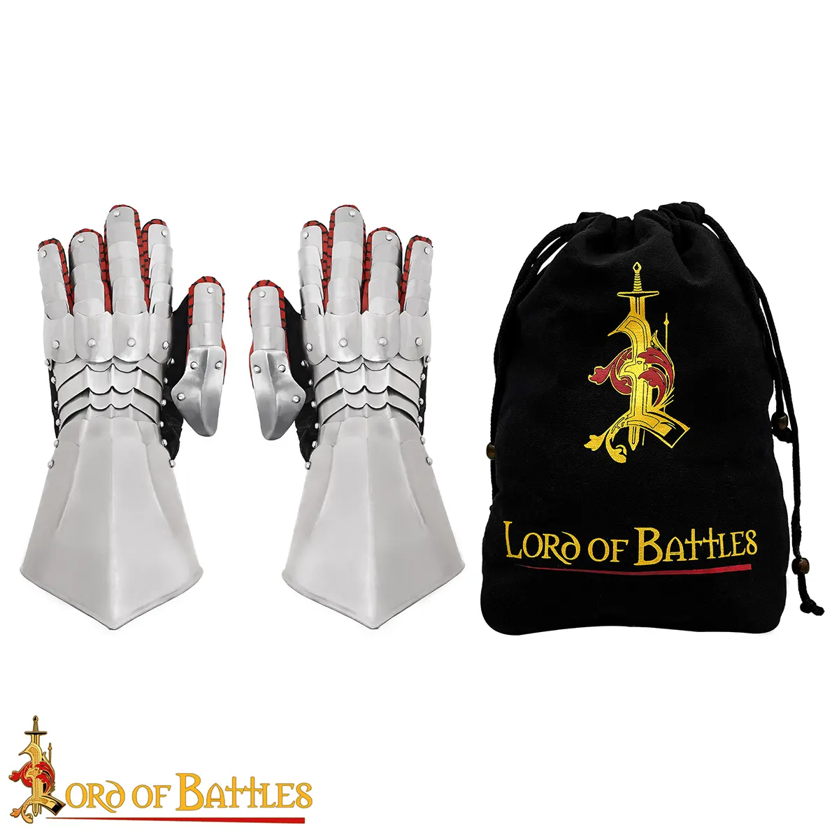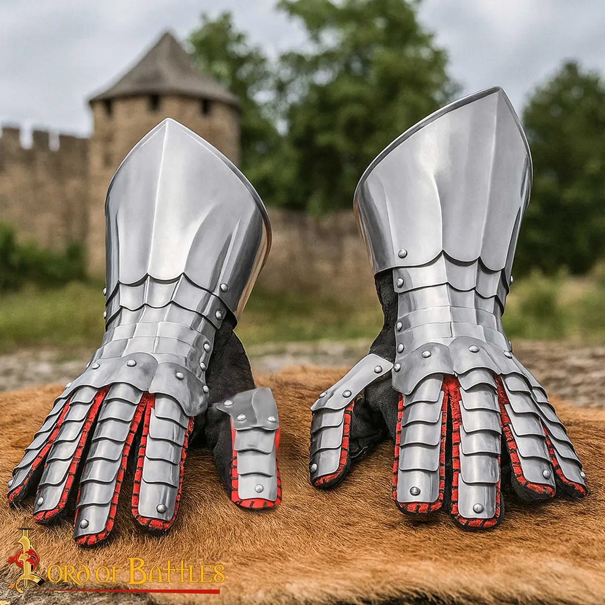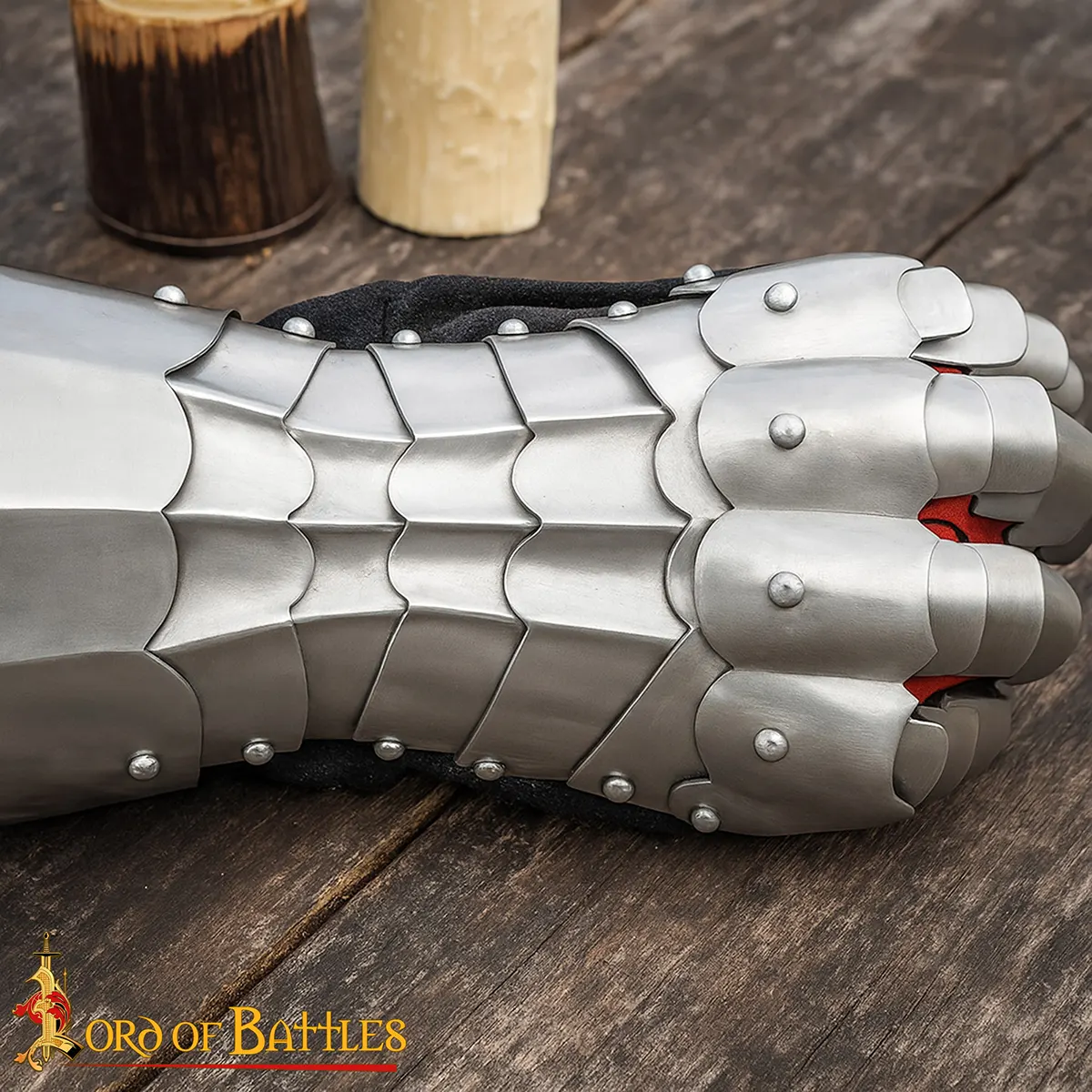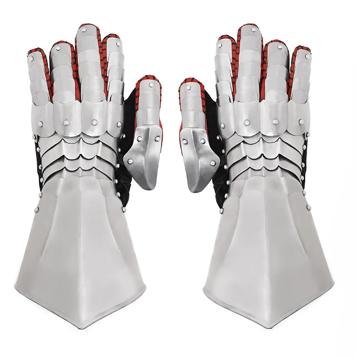 The overlapping steel plates are riveted for smooth articulation and reliable defense against heavy blows. Whether holding a sword, axe, or shield, these gauntlets give you the freedom and safety needed in battle. Their polished finish resists dents and scratches, and with time they develop a natural aged patina that adds authentic medieval character.