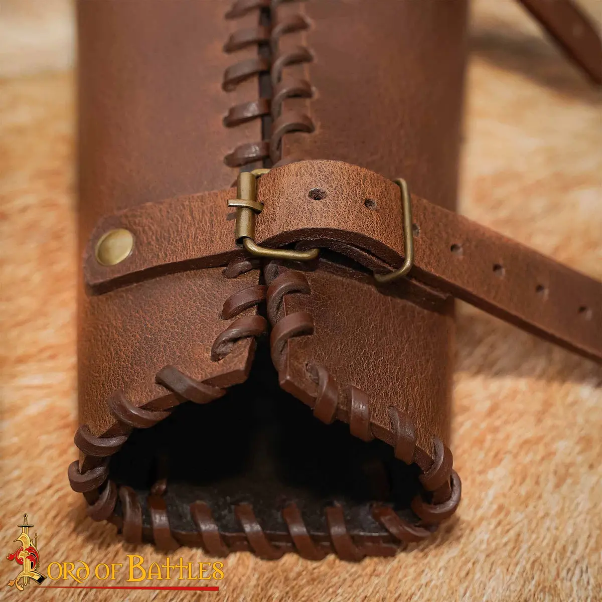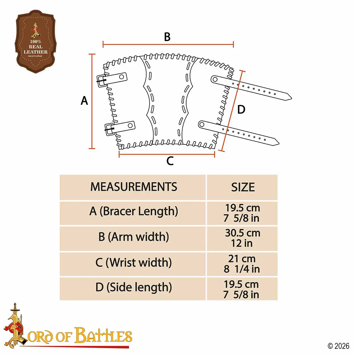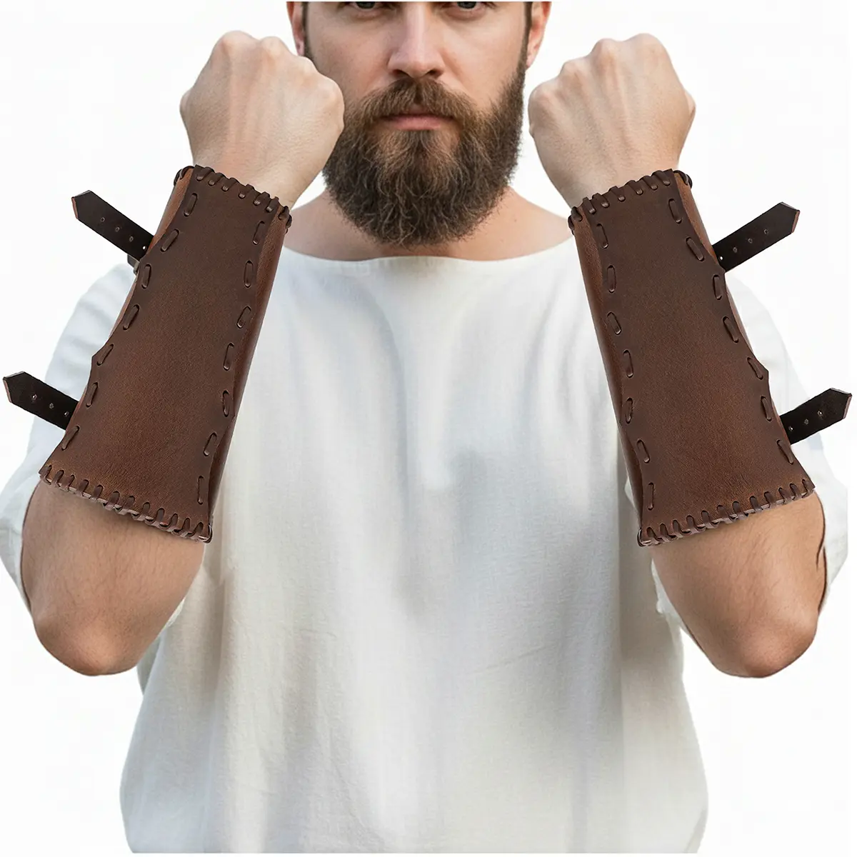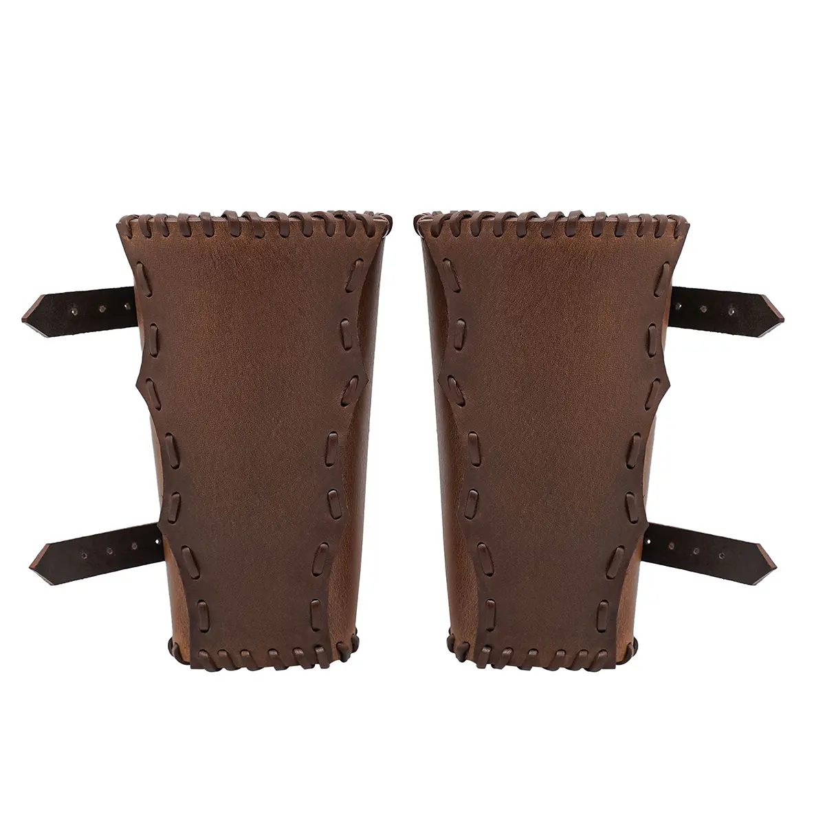 Secure & Adjustable Fit: Each bracer is fitted with two leather straps with antique brass buckles for a secure closure. Multiple adjustment holes in the straps help the leather arm bracers to be tightened or loosened to match different forearm sizes and shapes, ensuring a comfortable and personalized fit.