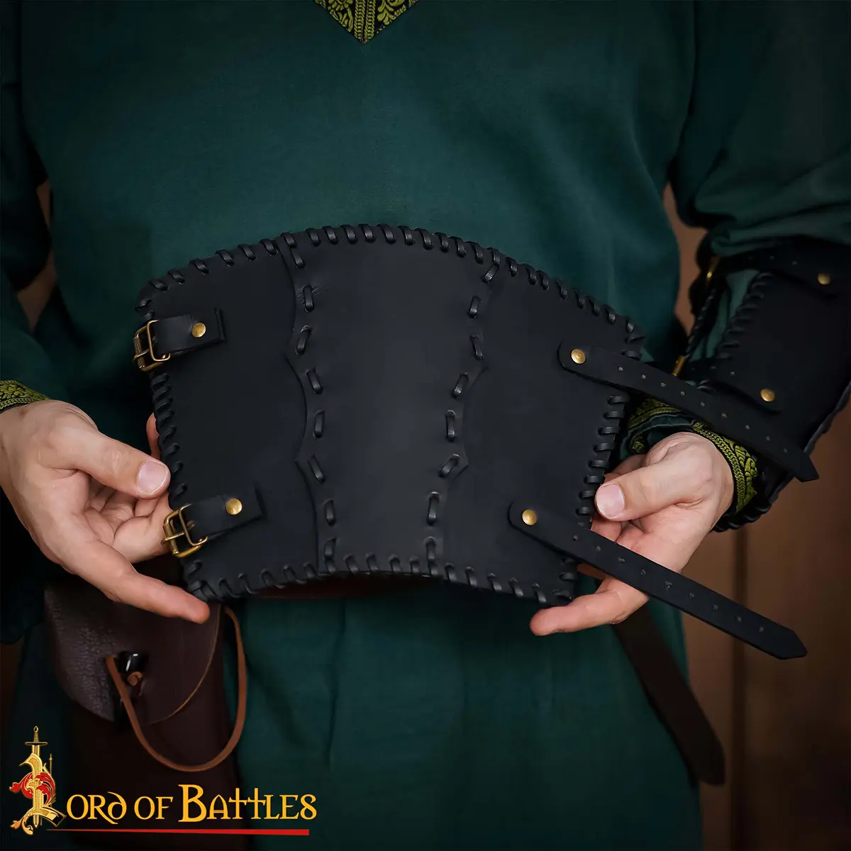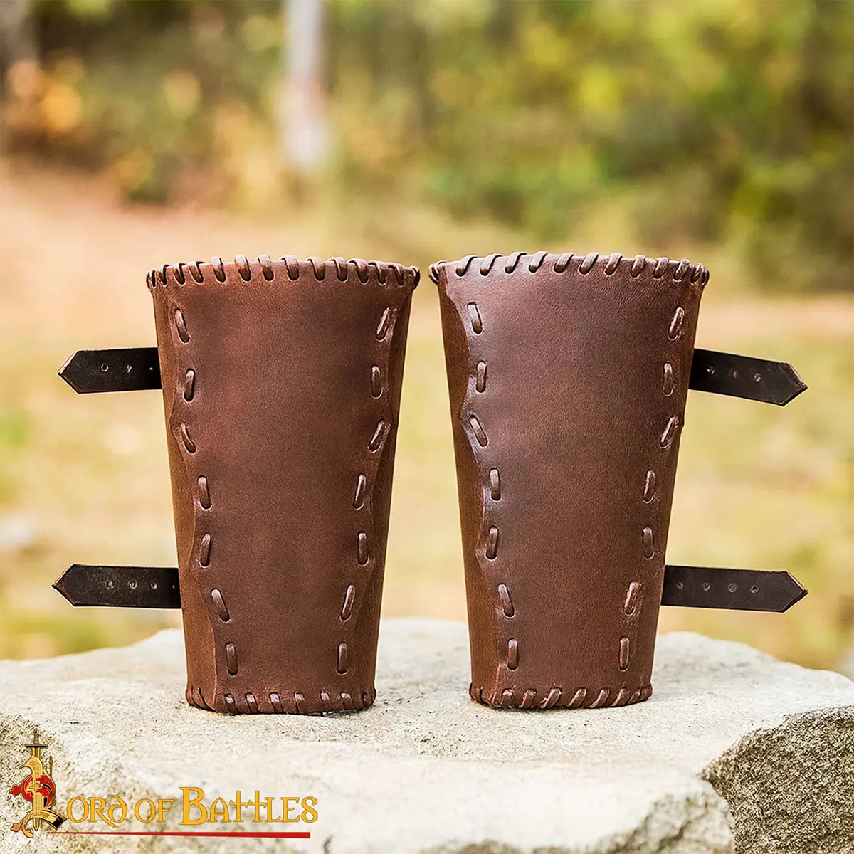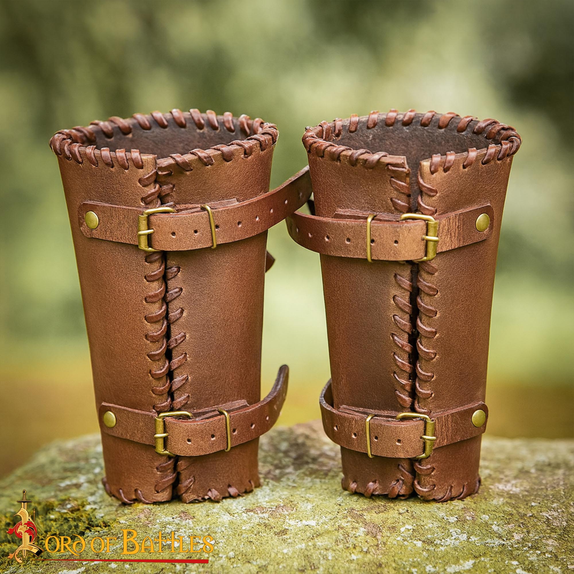 Materials: Made from thick leather, these Leather bracers are rigid and sturdy and are comfortable for arm movement. The thickness of the leather helps absorb impacts and gives a reliable forearm protection. The edges are carefully finished and have a braided leather cord, for strength with a clean appearance