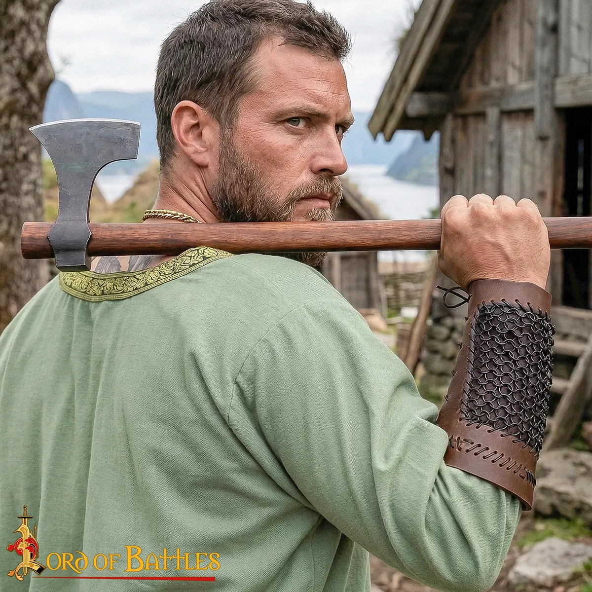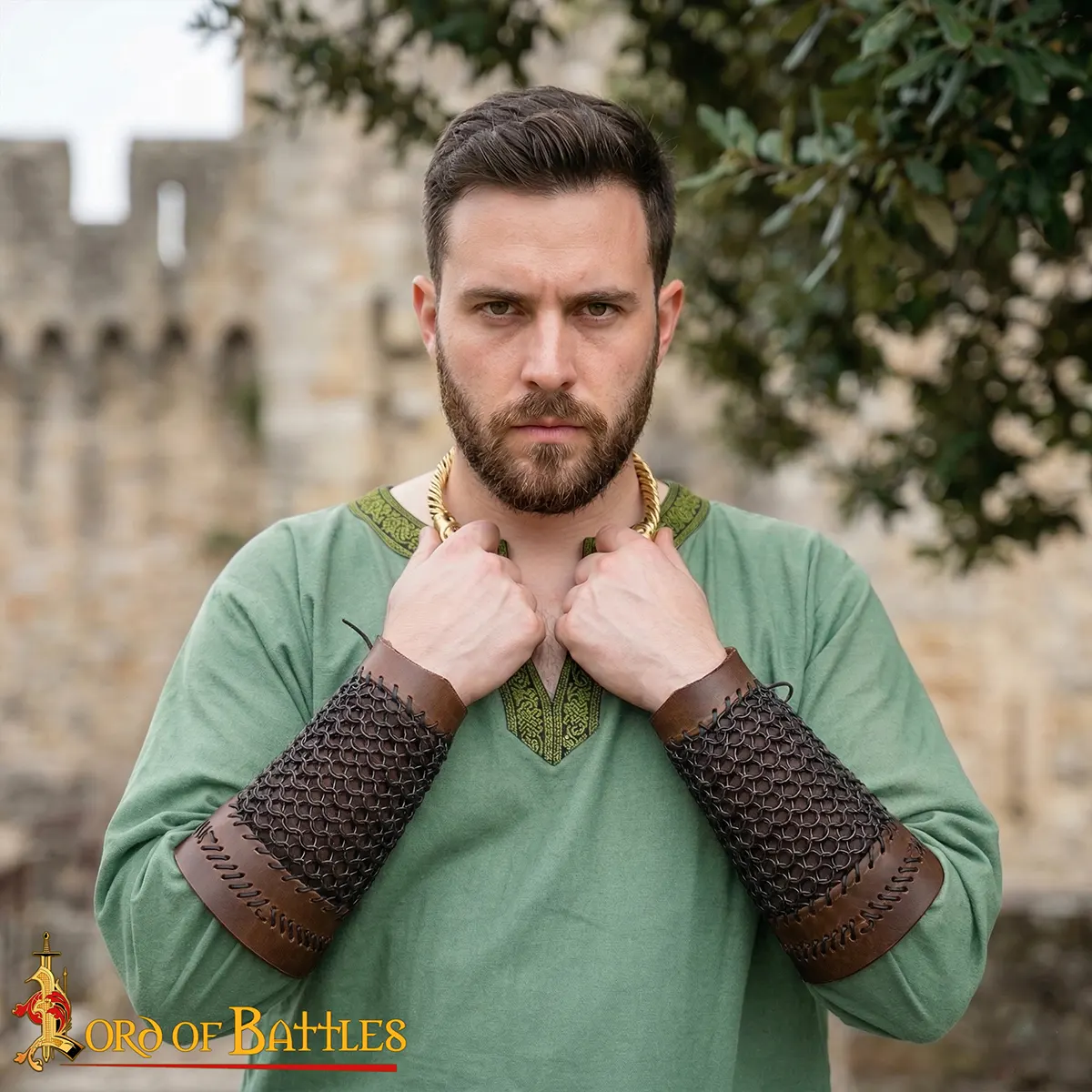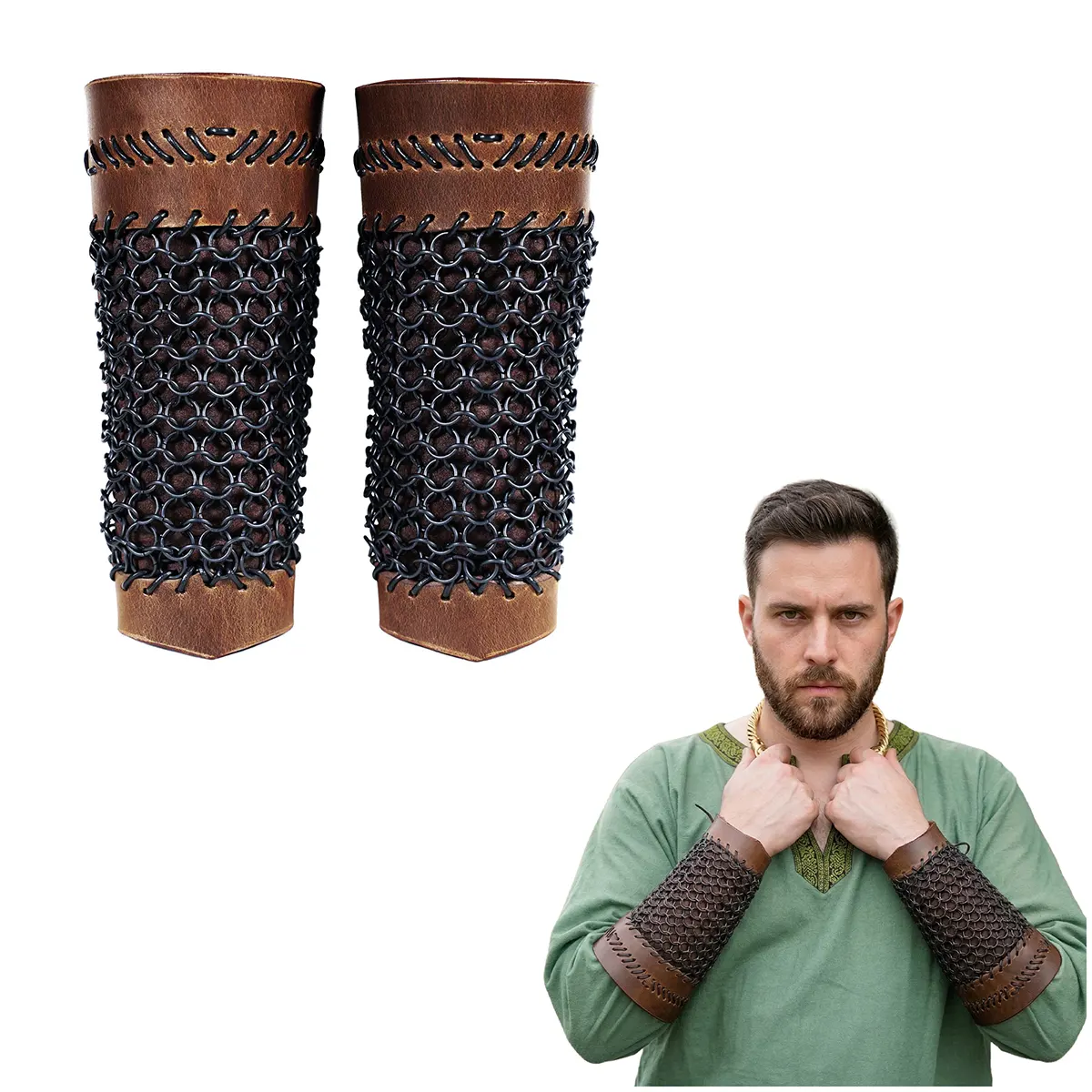 Leather Arm Bracers with Chainmail Detailing: These Leather Arm bracers are made for warriors, hunters, and fantasy characters who want both visual look and protection. Made with a strong leather base and reinforced with chainmail, they mix medieval crafting with a bold, battle-ready look.