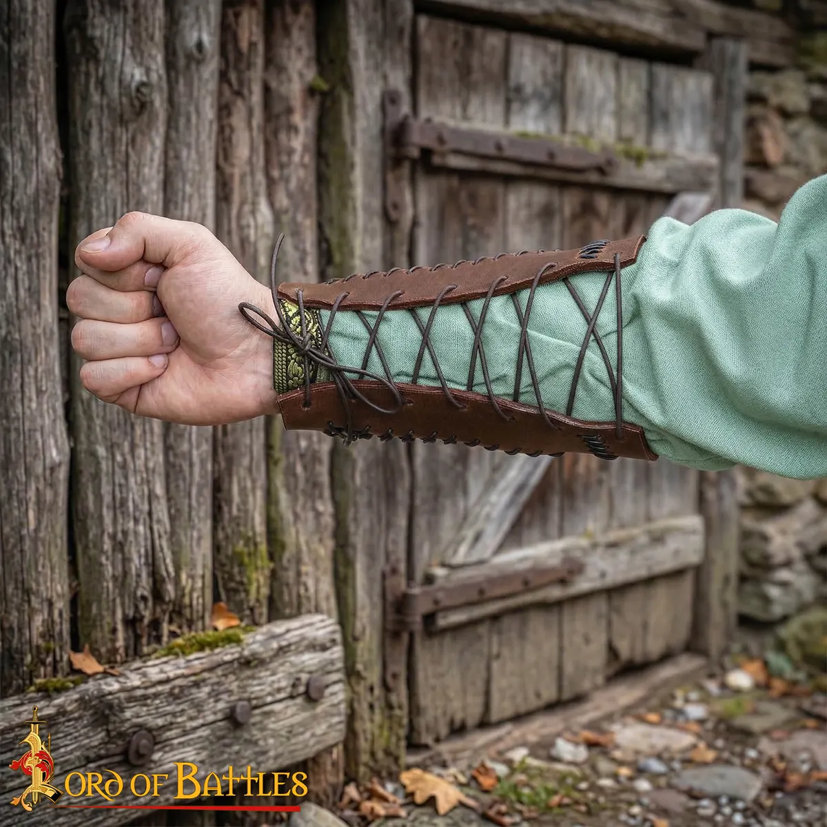 Crafted from durable genuine leather, the bracers act as a solid forearm guard and remain flexible for long wear. The leather panels are crafted by hand for both strength and rustic character, giving them a medieval look for fantasy and historical settings.