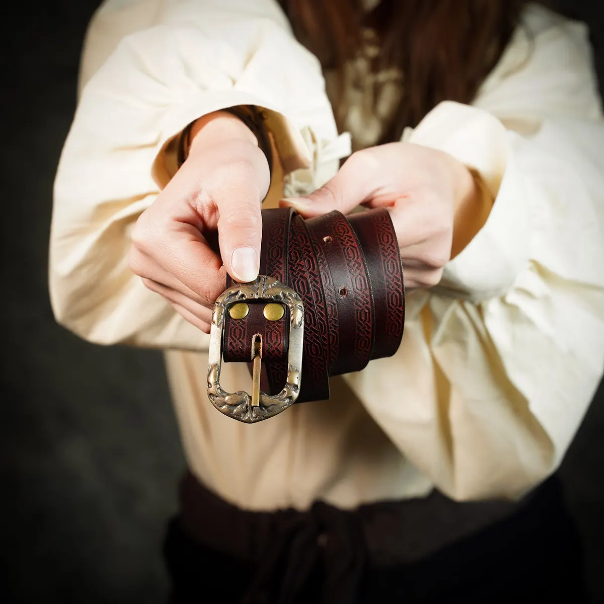 I was pleasantly surprised by my new handcrafted leather belt! It arrived in just a few days, packed securely in a stylish box that protected it perfectly during shipping. Out of the box, the belt looked even better than the pictures—rich leather with a beautiful embossed design that really stands out. The antique brass buckle adds a lovely vintage touch that I adore. This belt has a solid feel, showing promise with its durability; I can tell it will last for years to come. I wore it to a casual outing, and it finished off my outfit beautifully. I’ve already received several compliments on it! It’s also versatile enough for my LARP events, making it a great investment. Overall, I’m extremely satisfied with this purchase; it exceeded my expectations and added a stylish flair to both my everyday looks and costume ensembles!
