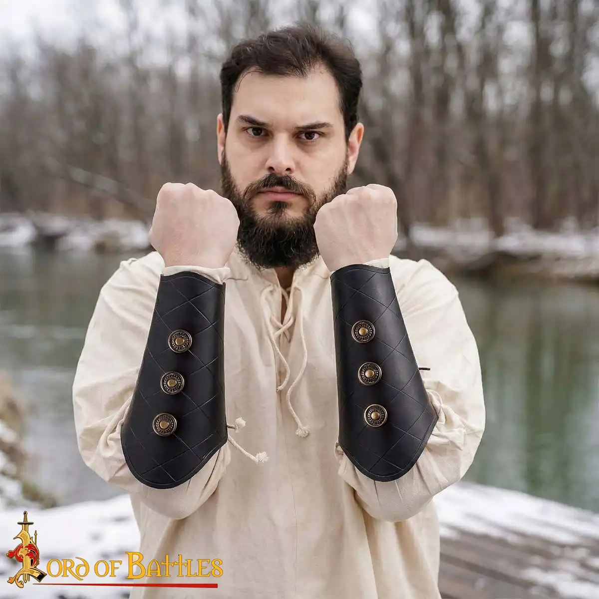 Crafted with meticulous attention to detail, these bracers are made from robust genuine buff leather, ensuring that you’ll enjoy both durability and comfort. Each pair is designed for long-lasting performance, allowing you to engage in battles, quests, or costume events without worrying about wear and tear. The combination of quality material and expert craftsmanship makes these bracers an essential accessory for anyone delving into the world of medieval fantasy.