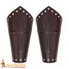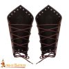 The bracers are secured with cross-lacing at the back, threaded through reinforced metal eyelets. This adjustable system ensures a customizable fit for various arm sizes, whether worn over simple fabric sleeves, a tunic, or layered alongside chainmail and plate armor. The laces also add a rugged medieval aesthetic, enhancing the bracers’ authentic look.