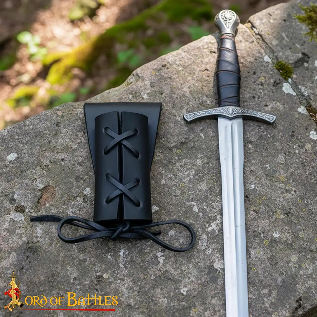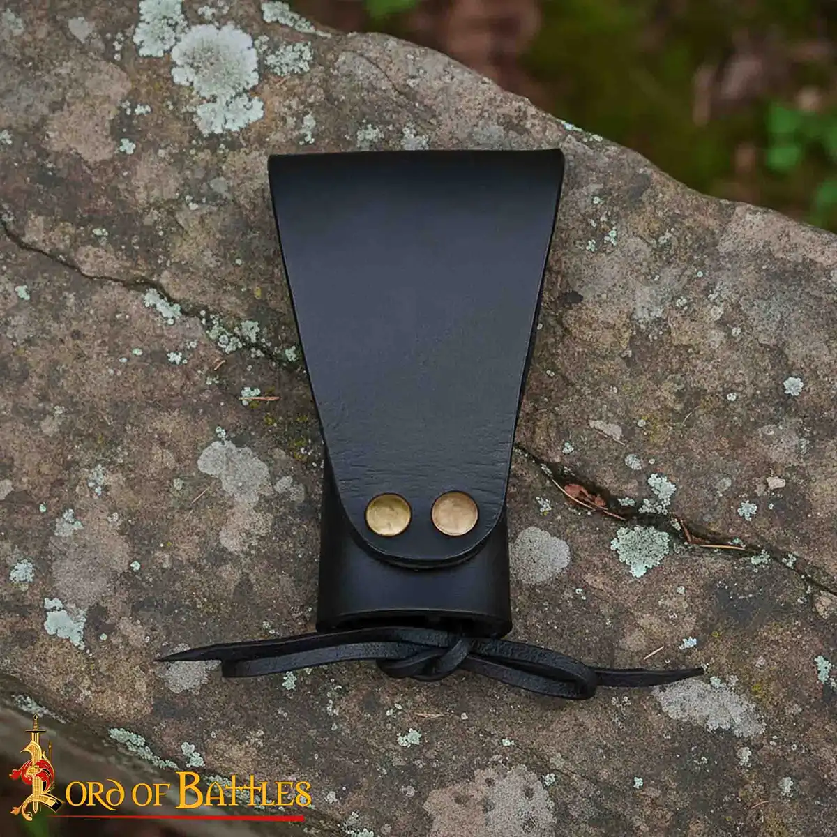 The frog has an adjustable leather lace at the front, so that it fits different blade widths easily. This makes it suitable as a dagger frog or an axe frog, depending on your equipment. The rear belt loop is reinforced with antique brass rivets, for a secure fit on belts.