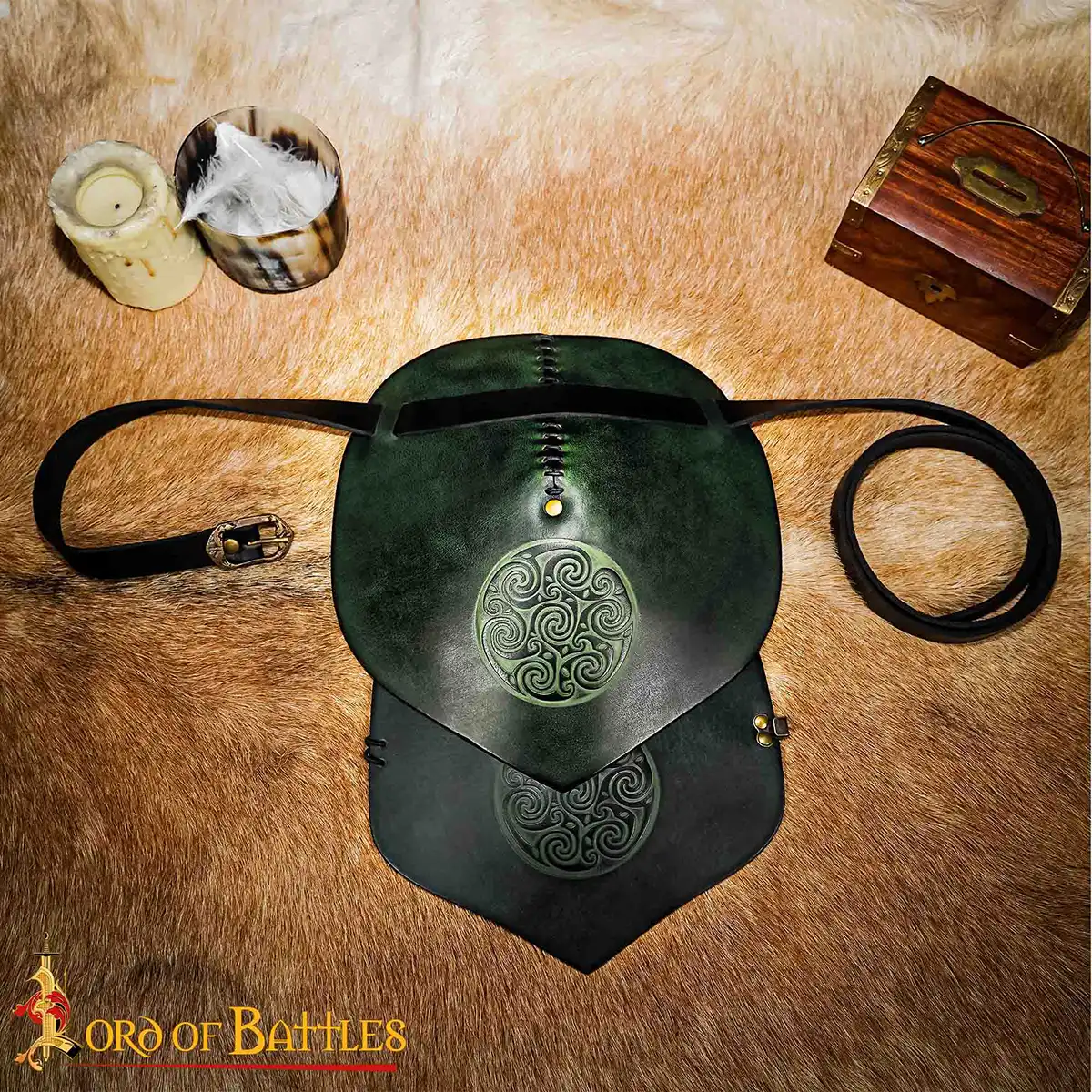 Looking for the best accessory that could make your ordinary Viking costume a truly outstanding one? This leather pauldron, richly embossed with Celtic Spiral design, will surely befit this character. This pauldron is provided as a single shoulder costume piece.