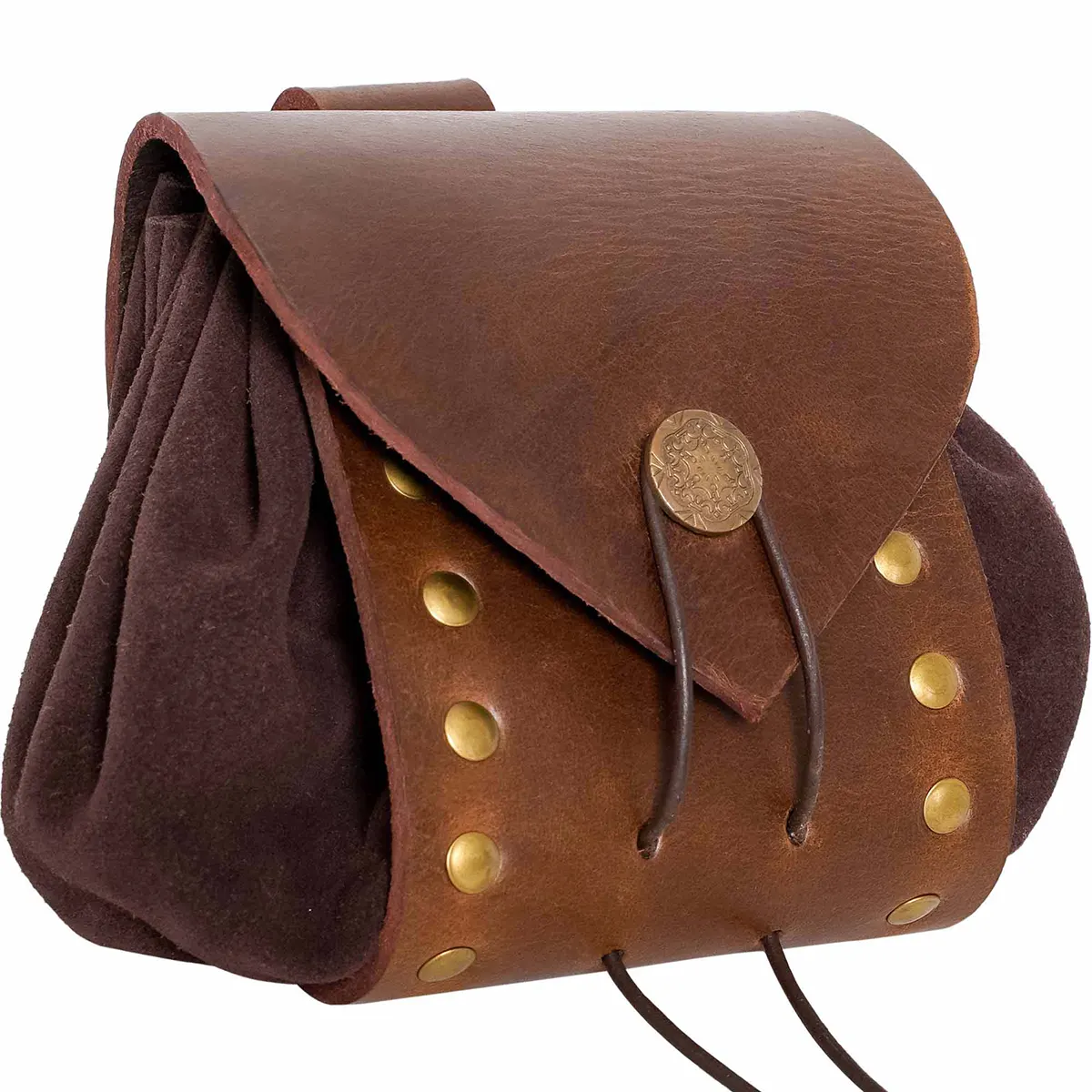 Medieval Belt Pouch – Suede Leather with Antique Brass Rivets: This leather pouch medieval, is a mix of both function and medieval look. Made for a historically appealing look, this pouch is suitable for Renaissance fairs, LARP events, or daily wear.