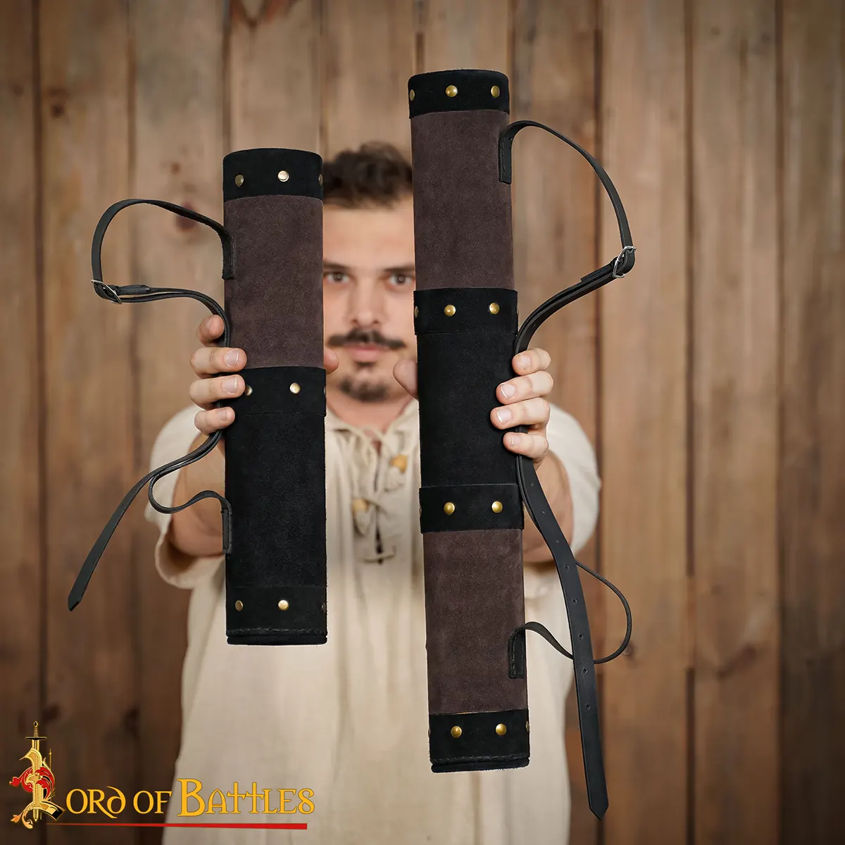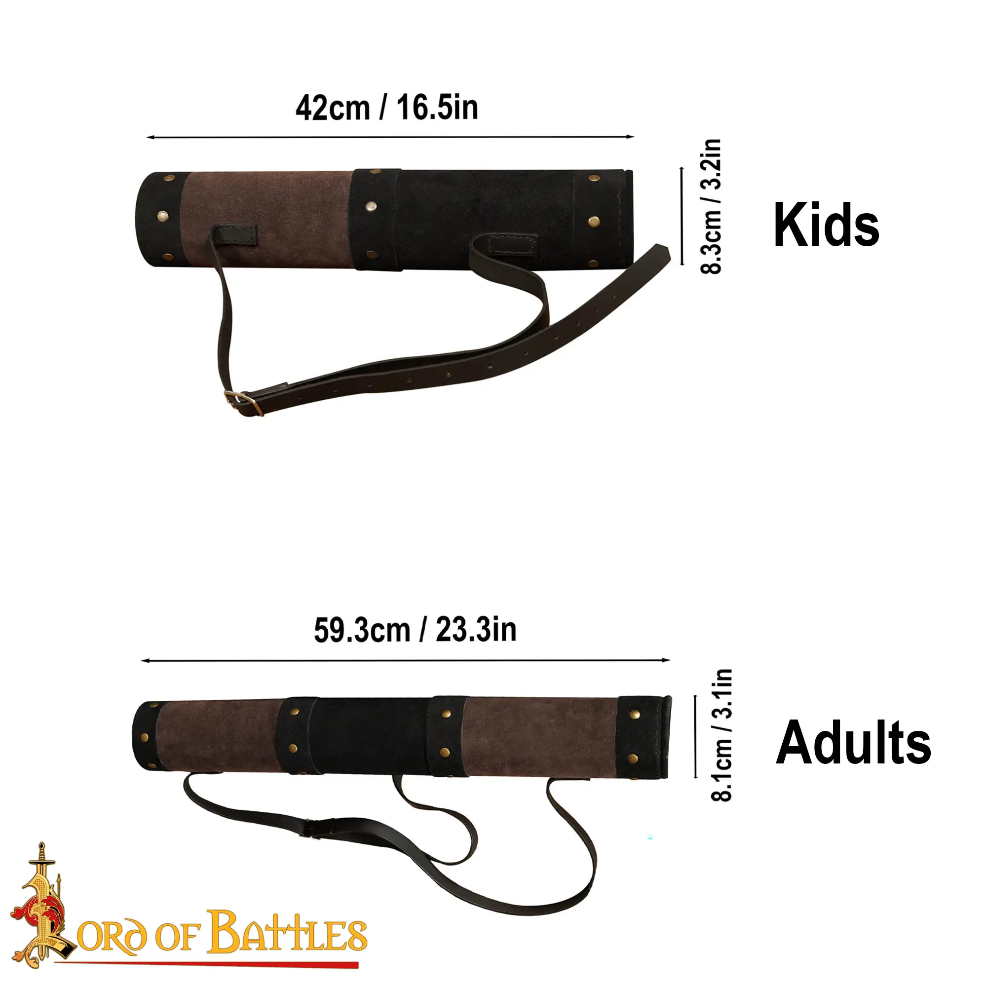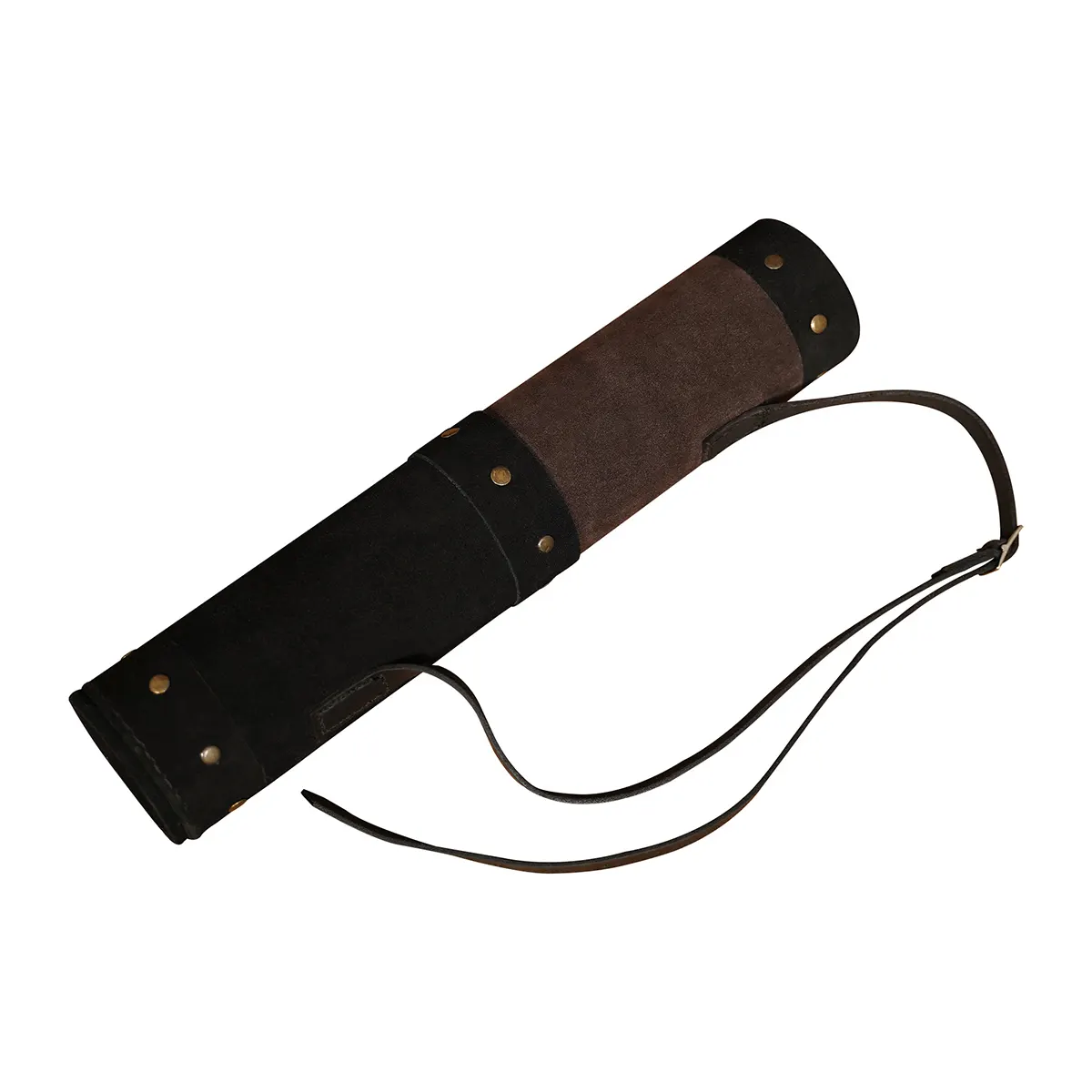 This handmade suede leather quiver blends practical function with medieval style, making it ideal for both archers and historical enthusiasts. Crafted from two-tone suede in brown and black, it features brass rivet reinforcement and a sturdy cylindrical body designed to keep arrows secure while moving or drawing.